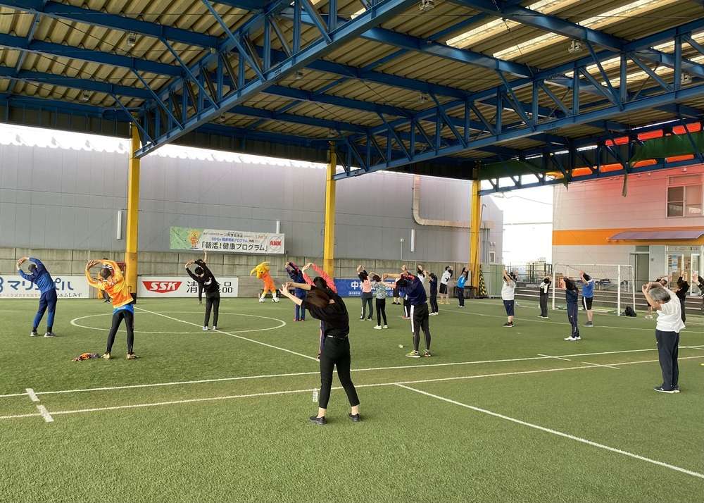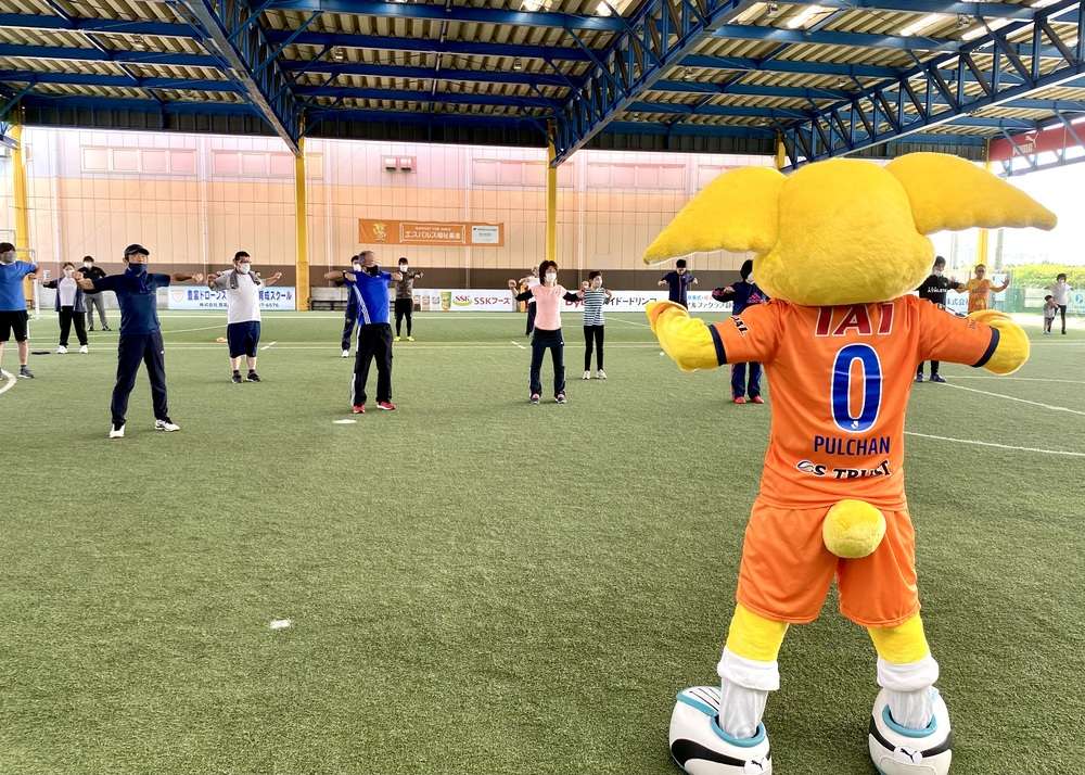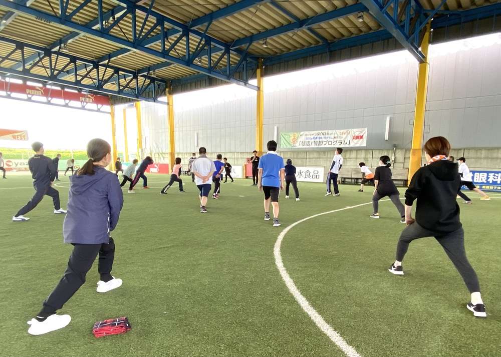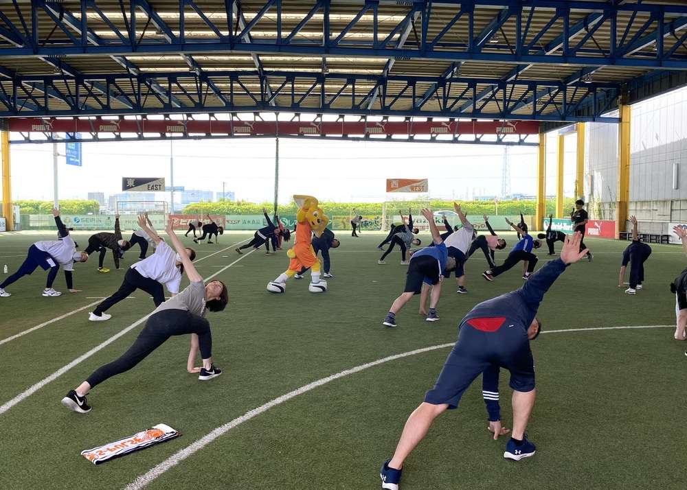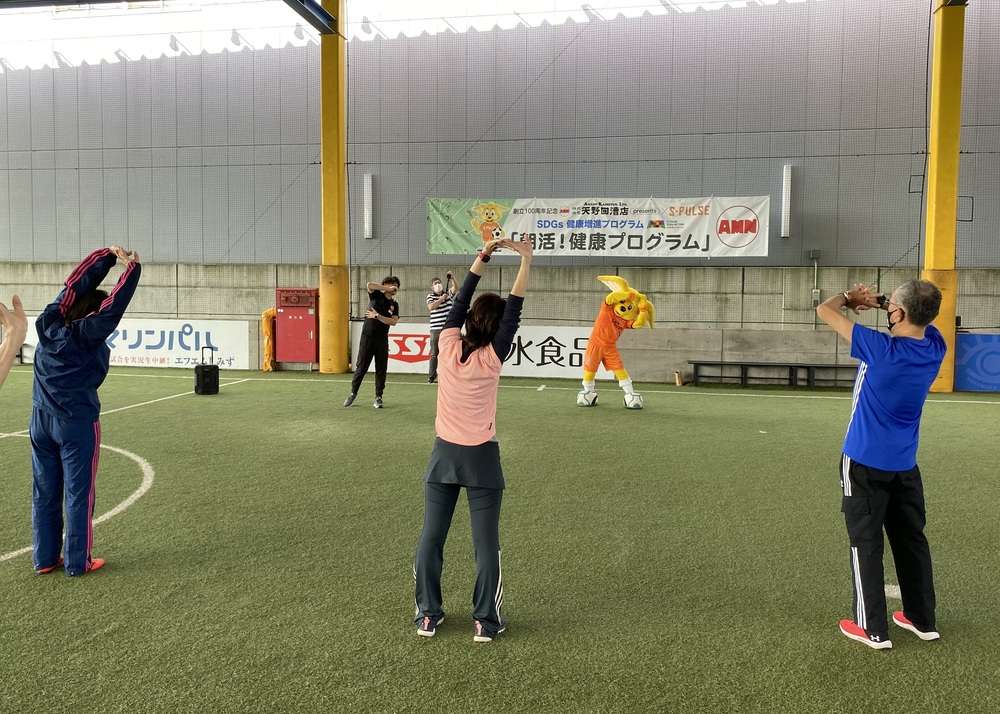 初回となる「腰痛、肩こり改善コース≫」~身も心もリフレッシュ~を、5月27日(土)7時30分より、エスパルスドリームフィールド清水にて開催し、33名の皆様にご参加いただきました。また、当日はパルちゃんも参加し、参加者の皆様と一緒に運動するなど、初回開催となる本企画を大いに盛り上げてくれました。