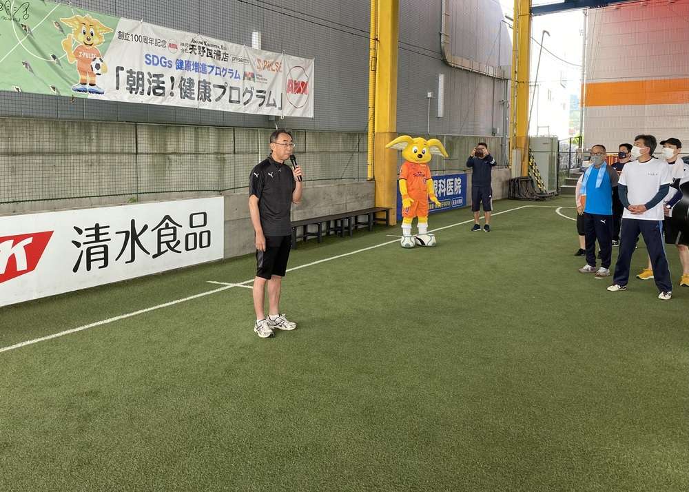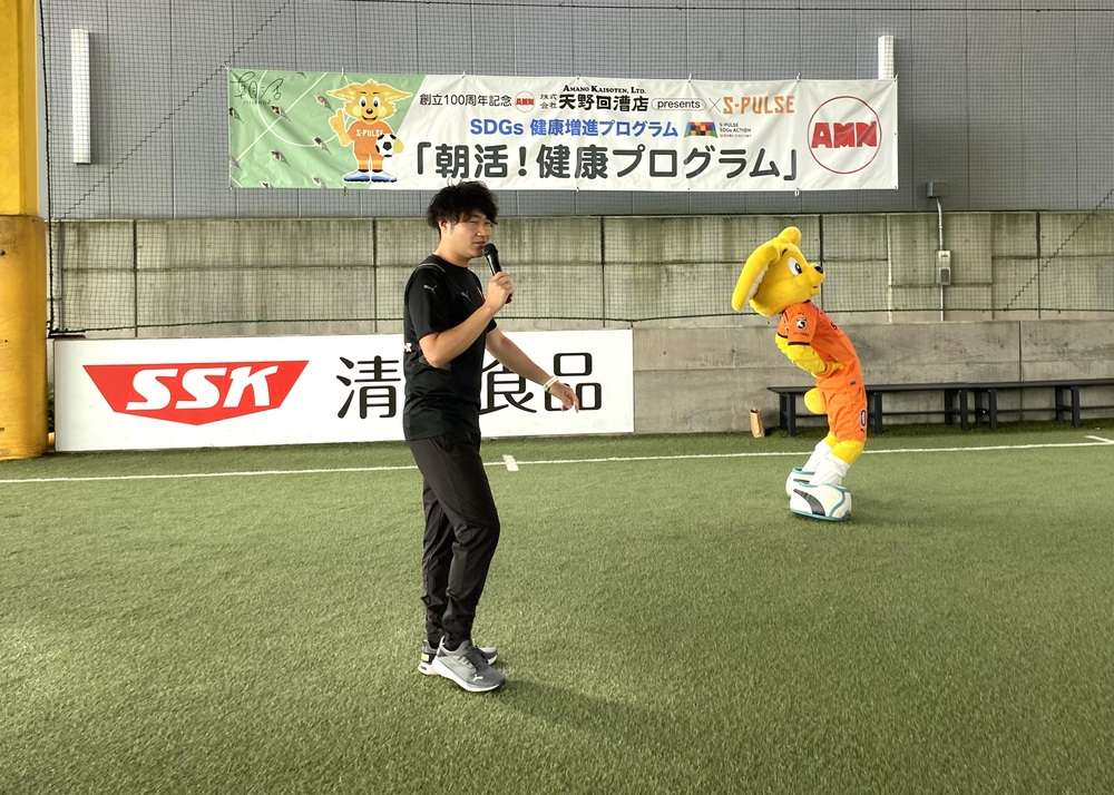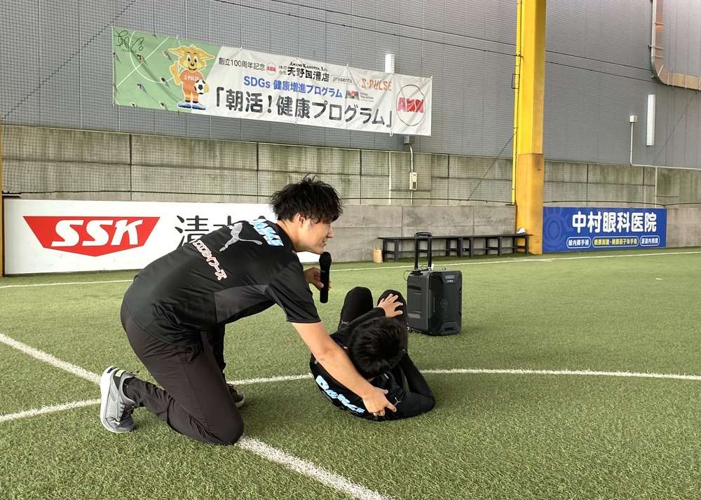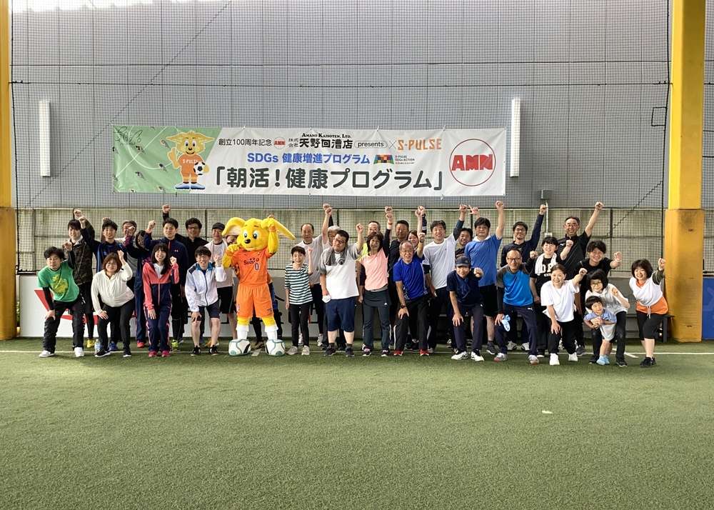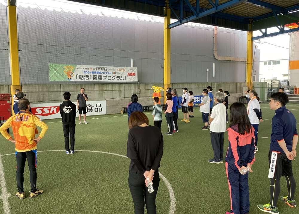 初回となる「腰痛、肩こり改善コース≫」~身も心もリフレッシュ~を、5月27日(土)7時30分より、エスパルスドリームフィールド清水にて開催し、33名の皆様にご参加いただきました。また、当日はパルちゃんも参加し、参加者の皆様と一緒に運動するなど、初回開催となる本企画を大いに盛り上げてくれました。