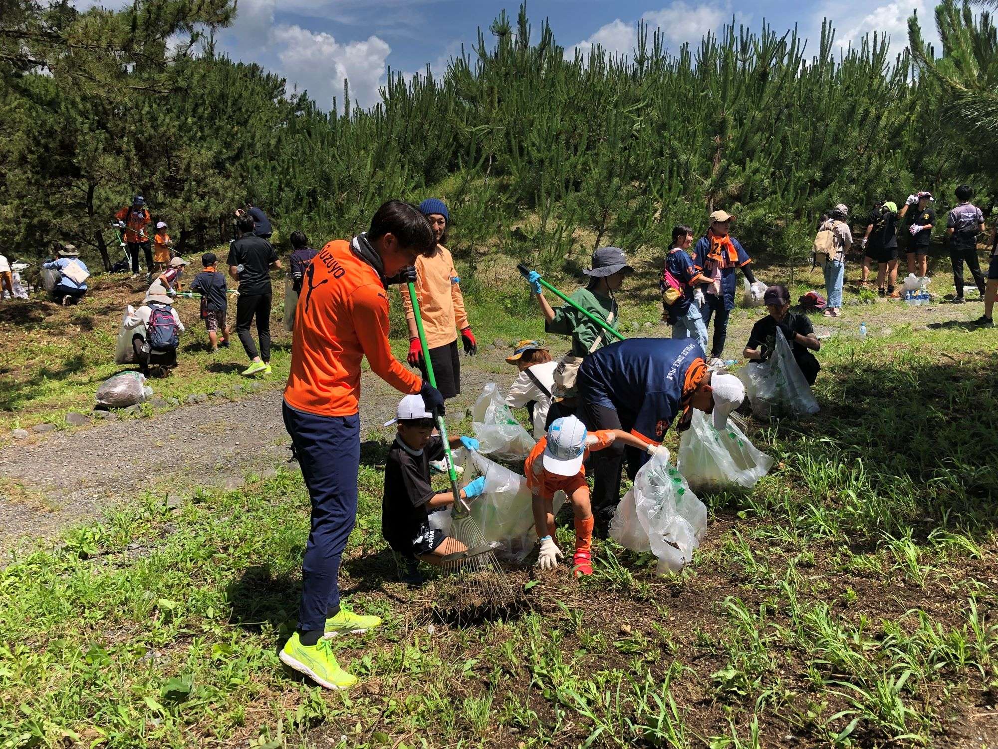 マツは栄養の少ない土地で育つことができる木です。しかし、松葉がたまって土地が豊かになってくると今度は他の木の森林に移り変わってしまいます。マツから別の木に移り変わらないようにするために松葉かきが必要となります。選手も熊手を使って松葉をかき集めたり、集めた松葉を袋に詰めて運んだり、参加者の皆さんと会話しながら楽しく活動を行い、作業エリアは予定よりも早くきれいになりました。参加者からは、「選手と一緒に活動ができて楽しかった」「なぜ松葉かきが必要か知れて勉強になった」「今回作業したのは三保松原のほんの一部なのでより多くのボランティアが必要」「保全が必要なことをたくさんの人に知ってもらいたい」といった感想をいただきました。