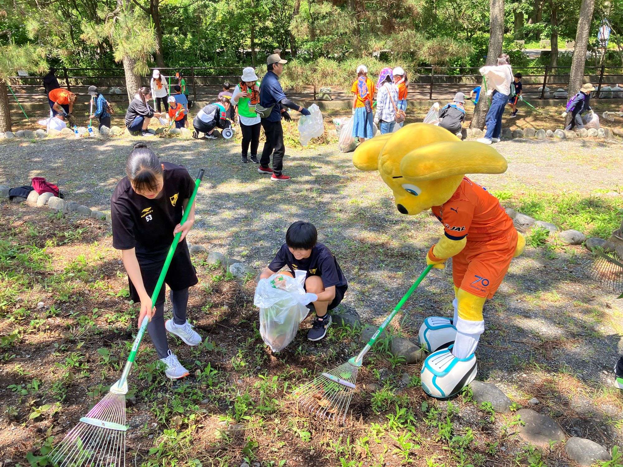 開会式の後、作業エリアに移動して早速活動がスタートです。今回イベントに参加したエスパルスの宮本航汰選手、齊藤聖七選手、監物拓歩選手、森重陽介選手、阿部諒弥選手、鈴木義宜選手、市川大祐コーチ、そしてパルちゃん、シズラも参加者の皆さんと一緒に活動を行いました。