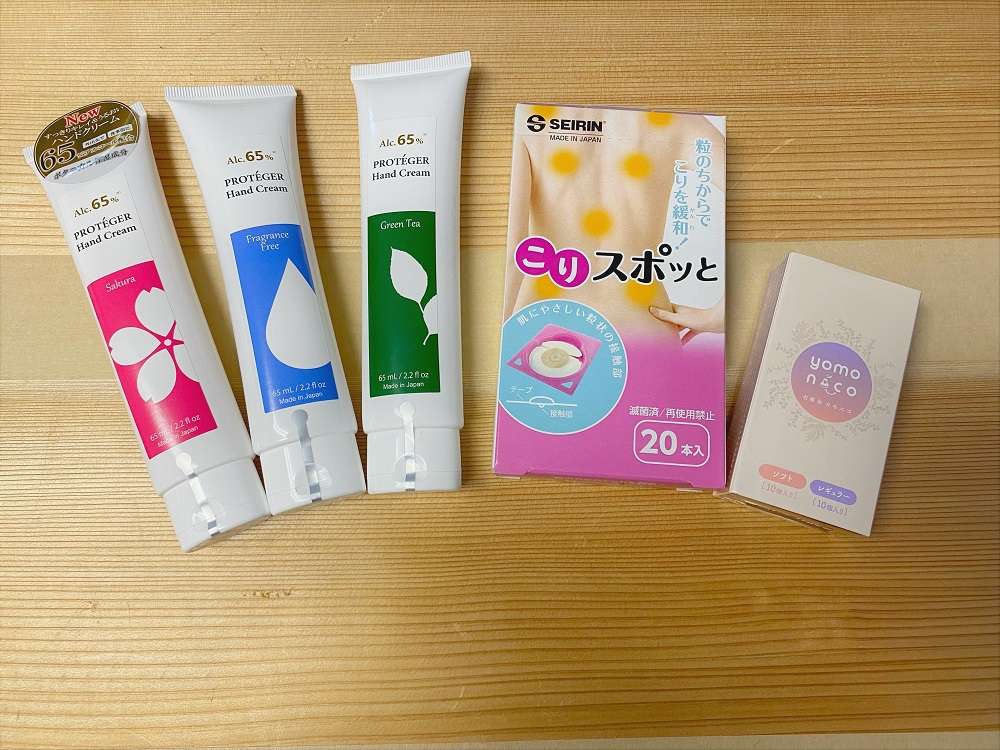 抽選会当選商品(ヨモニコ20個入り/こりスポッと20本入り1箱 /プロテジェハンドクリーム3種類各1本ずつ)