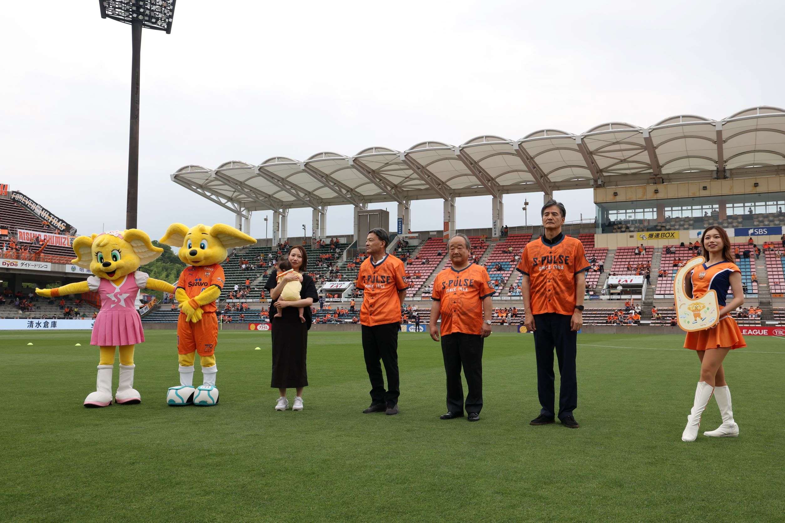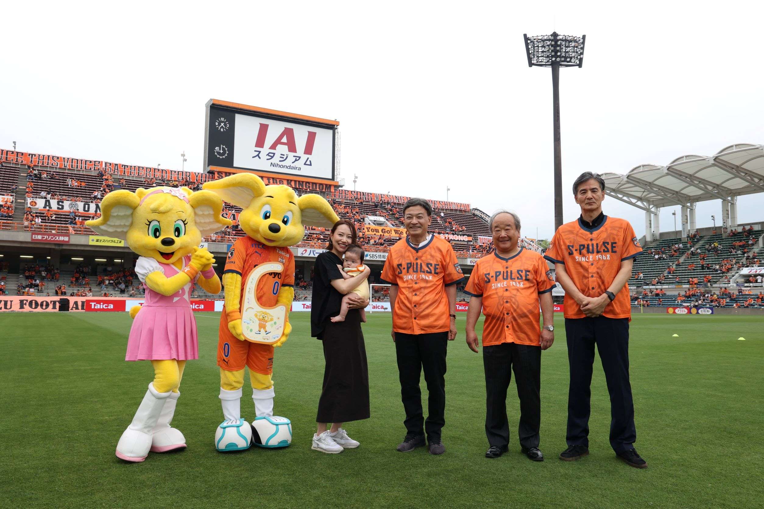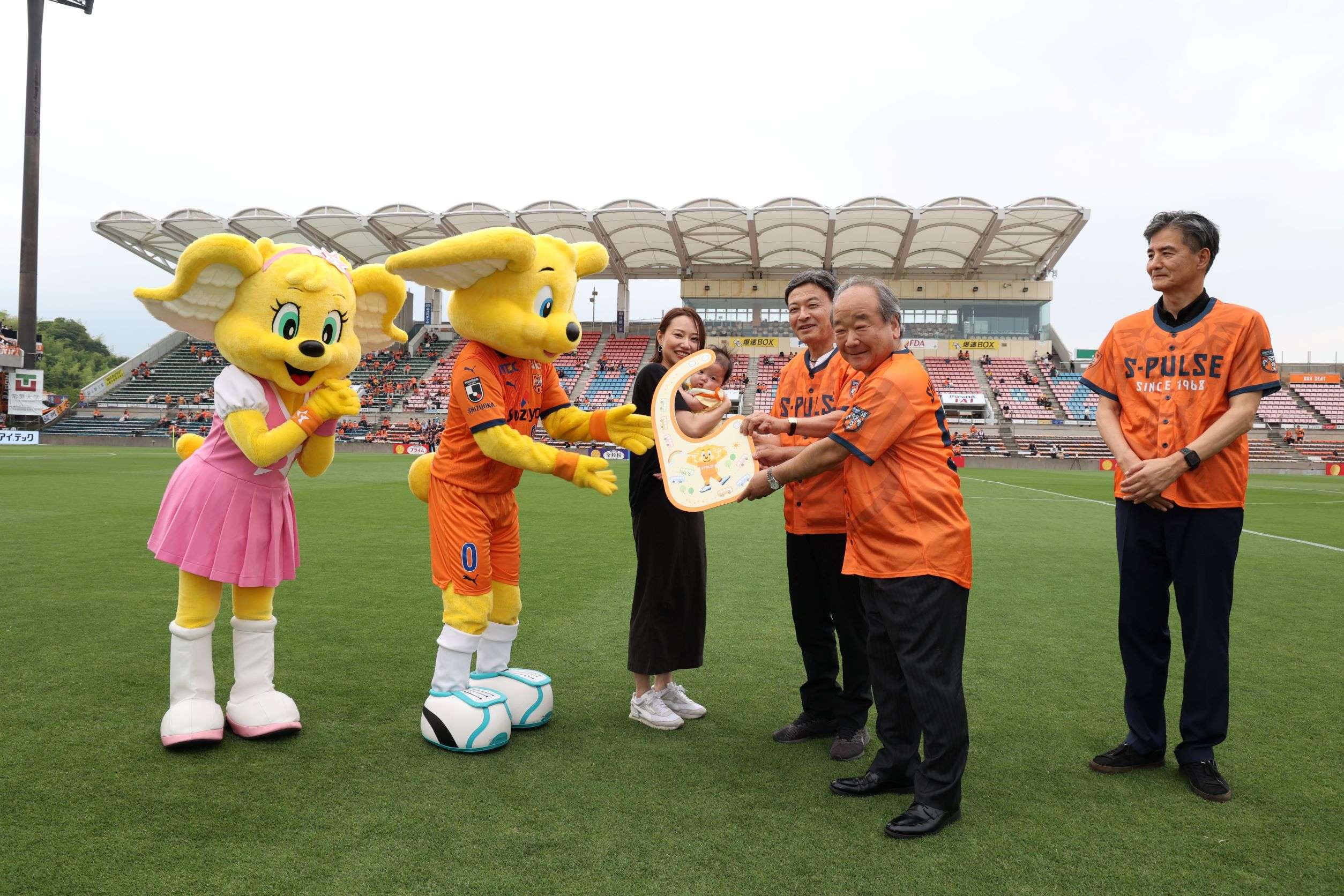 今年度は、6月18日(日)、IAIスタジアムにて贈呈式を行いました。贈呈式には、難波喬司静岡市長、当事業にご賛同いただきました、しずてつジャストライン株式会社代表取締役社長 三浦孝文様、㈱エスパルス 代表取締役社長山室晋也、オフィシャルマスコットパルちゃん、市民代表三浦紗和様、圭登くん親子にご出席いただきました。