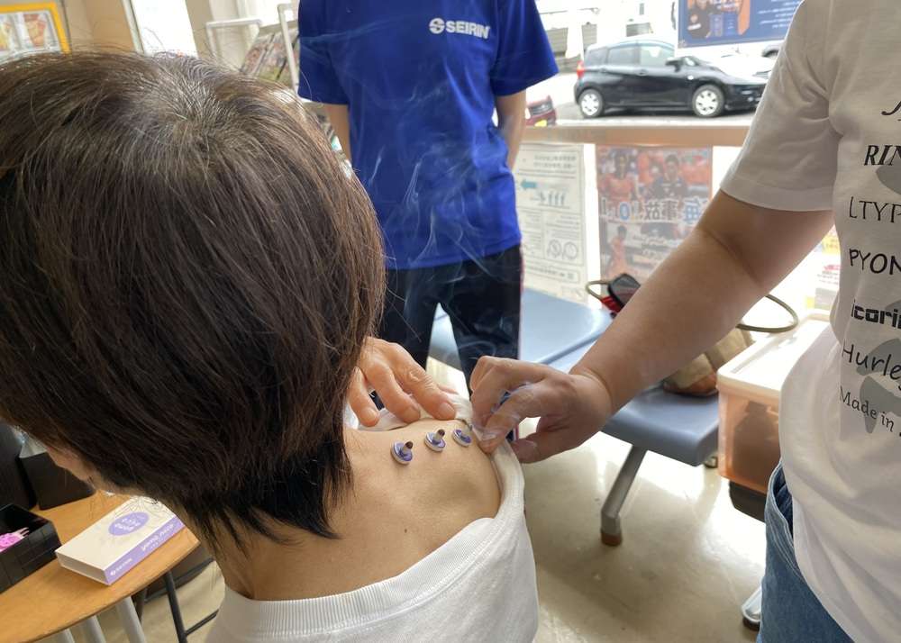 家庭用のセルフケア商品「こりスポッと」を使って、コリが気になる部位のツボに貼る「ツボ刺激体験」。丸いシールに小さな樹脂の粒が付いており、鍼のように刺さったりしないタイプなので、金属アレルギーの方や、鍼が苦手な方にも抵抗なく体験いただくことができます。また、新潟県産の上質なもぐさを使用したお灸「台座灸ヨモニコ」体験も可能です。参加者の皆さんは、それぞれコリが気になる部位に、運動の前や後に「ツボ刺激」体験をしていただき、セイリンの鍼灸商品の効果を実感いただけます。
