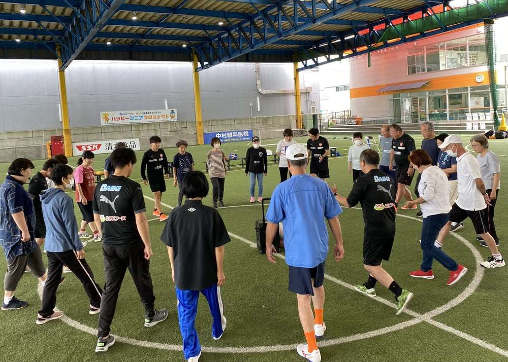 話す言葉と逆の動きをしたり、発する言葉は逆で動きはコーチと同じなど、円になって楽しみながら身体と脳を刺激していきました。