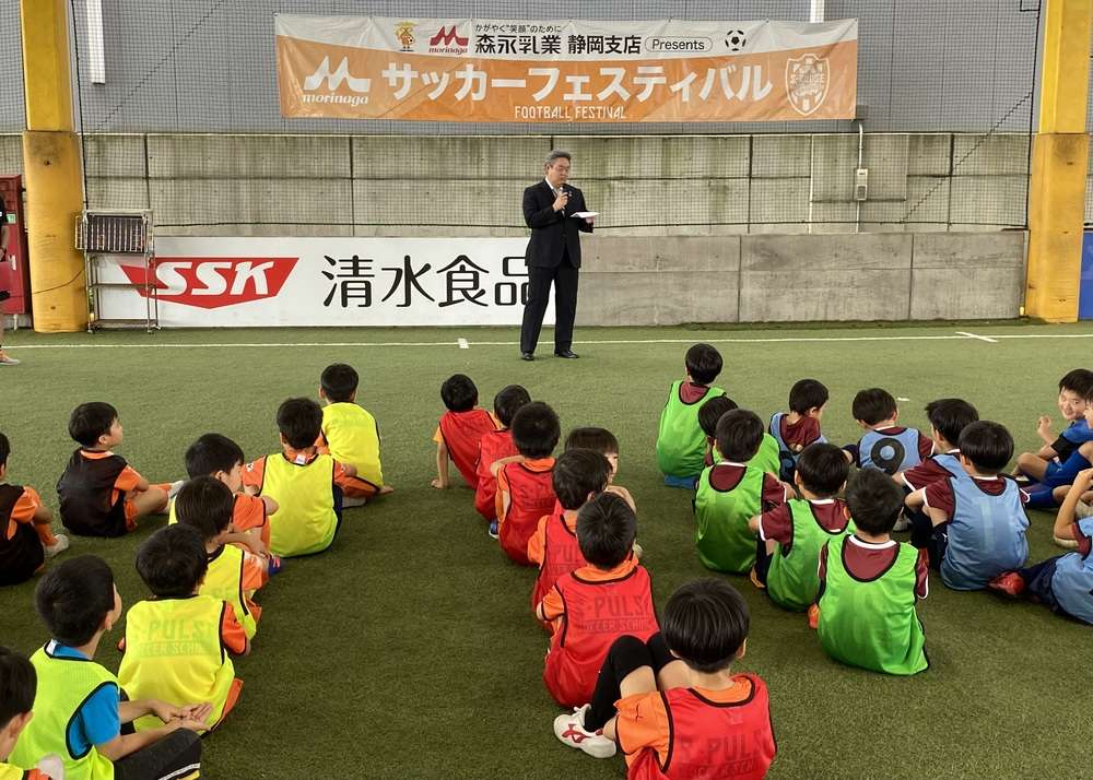 まずは、本日の大会のルールや栄養講習について説明。その後、森永乳業株式会社静岡支店の森俊郎 支店長にご挨拶いただき、『小学1.2年生ミニサッカー大会&ジュニアスポーツ栄養講座』がスタートしました。