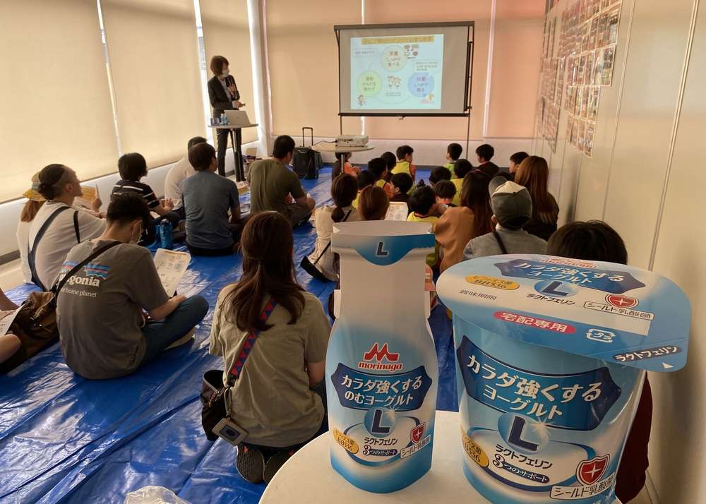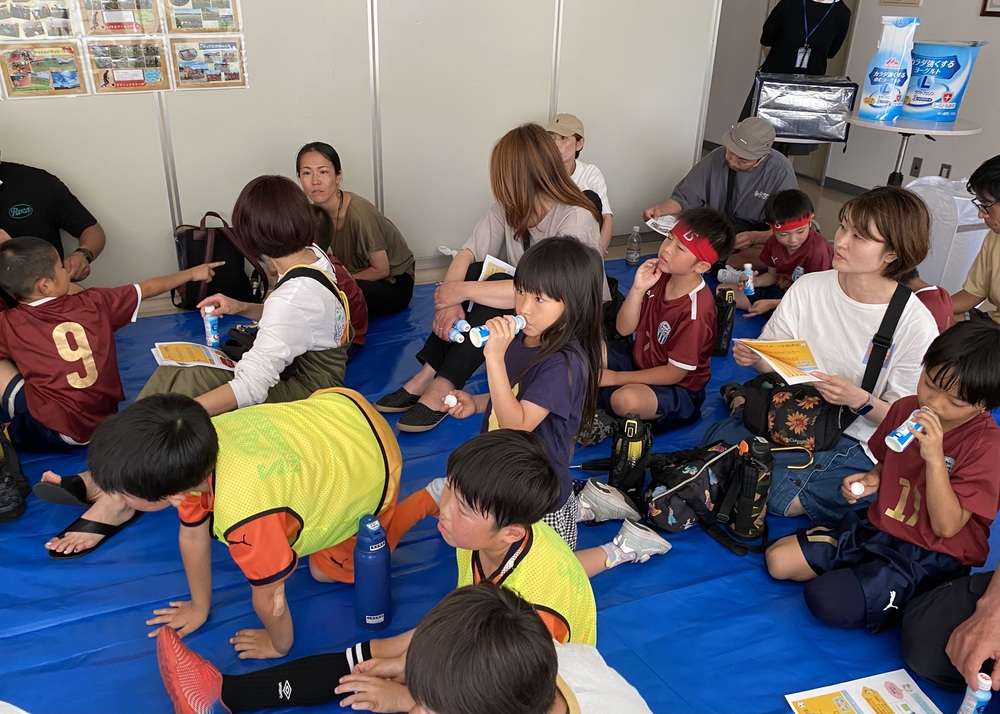 試合と試合の待ち時間を利用して、栄養講習会を開催しました。選手全員とその保護者、そして引率のコーチの皆様も参加いただき、森永乳業の「カラダ強くするのむヨーグルト」を試飲しながら、「ジュニア期のスポーツ栄養講座」~今しかできないからだづくり~をテーマに管理栄養士の先生よりお話しいただきました。