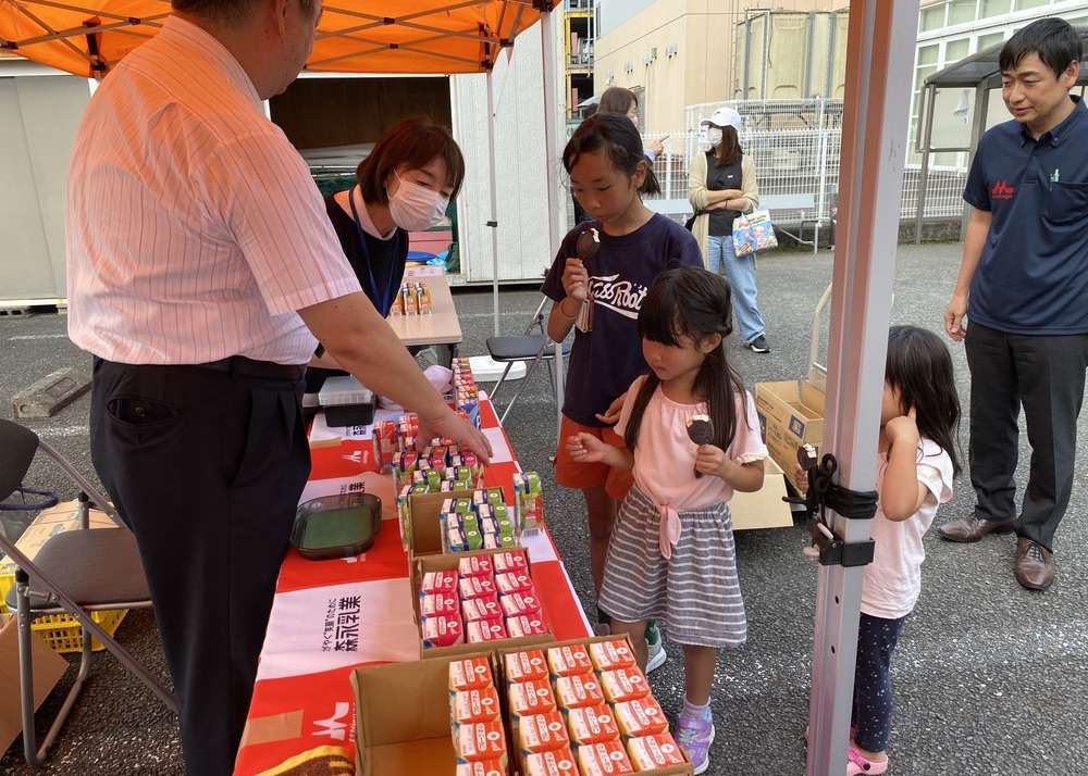 森支店長より缶バッチと森永製品3パックのプレゼント