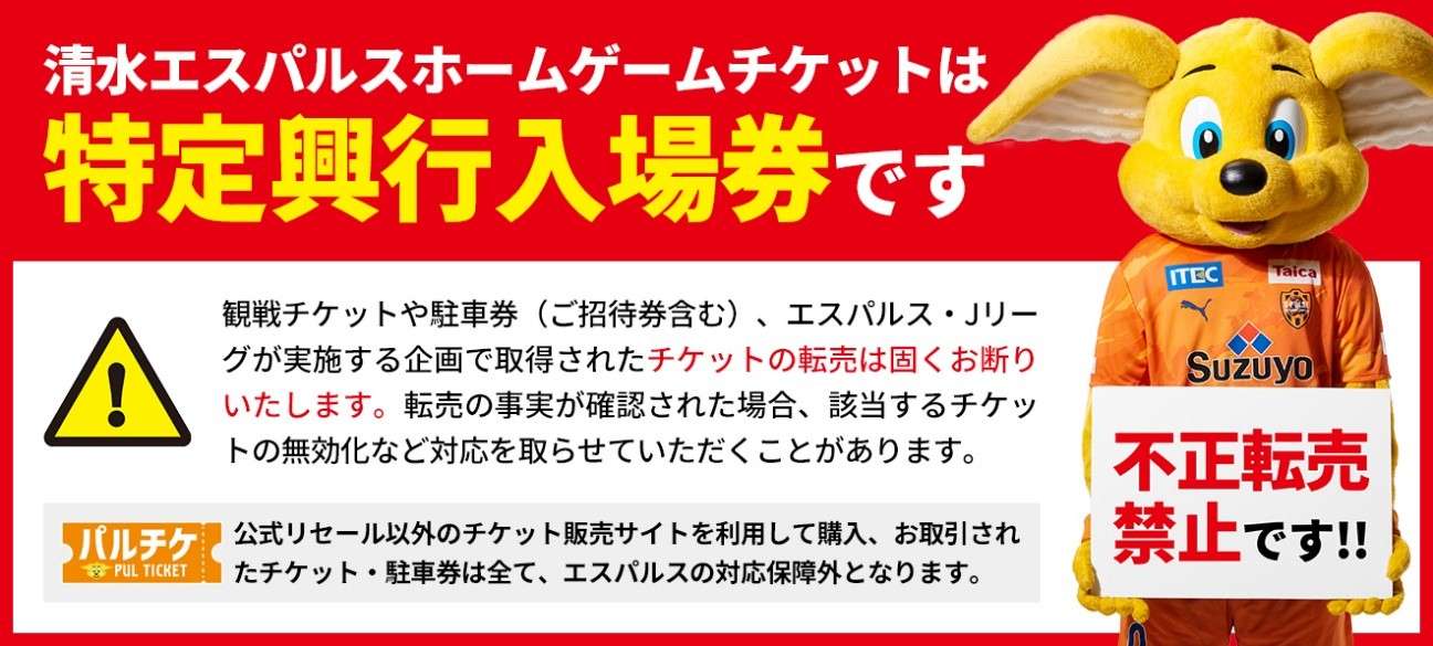 公式リセール以外のチケット販売サイトを利用して購入・お取引されたチケット・駐車券は全て、エスパルスの対応保障外となりますので、ご注意くださいますようお願いいたします。