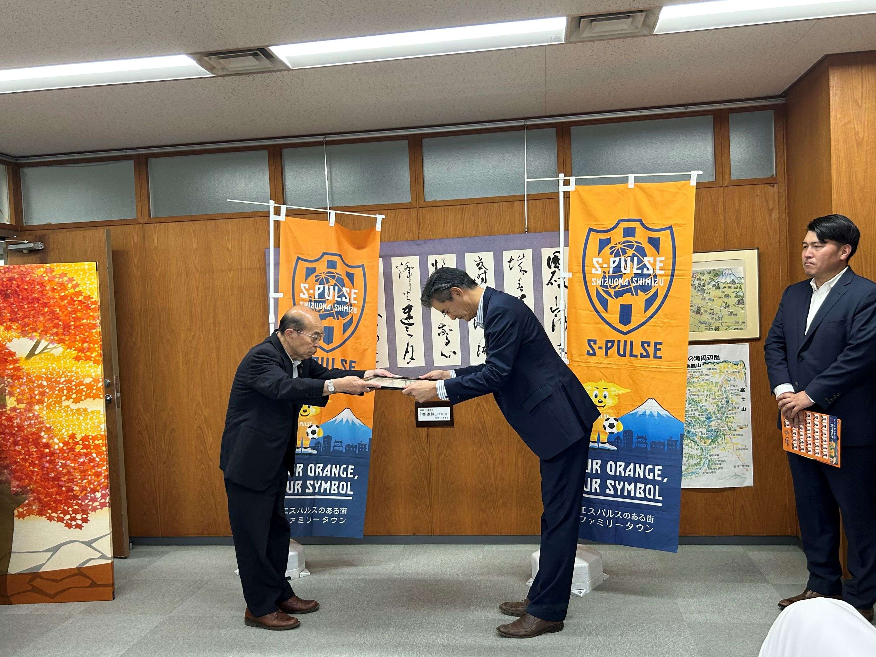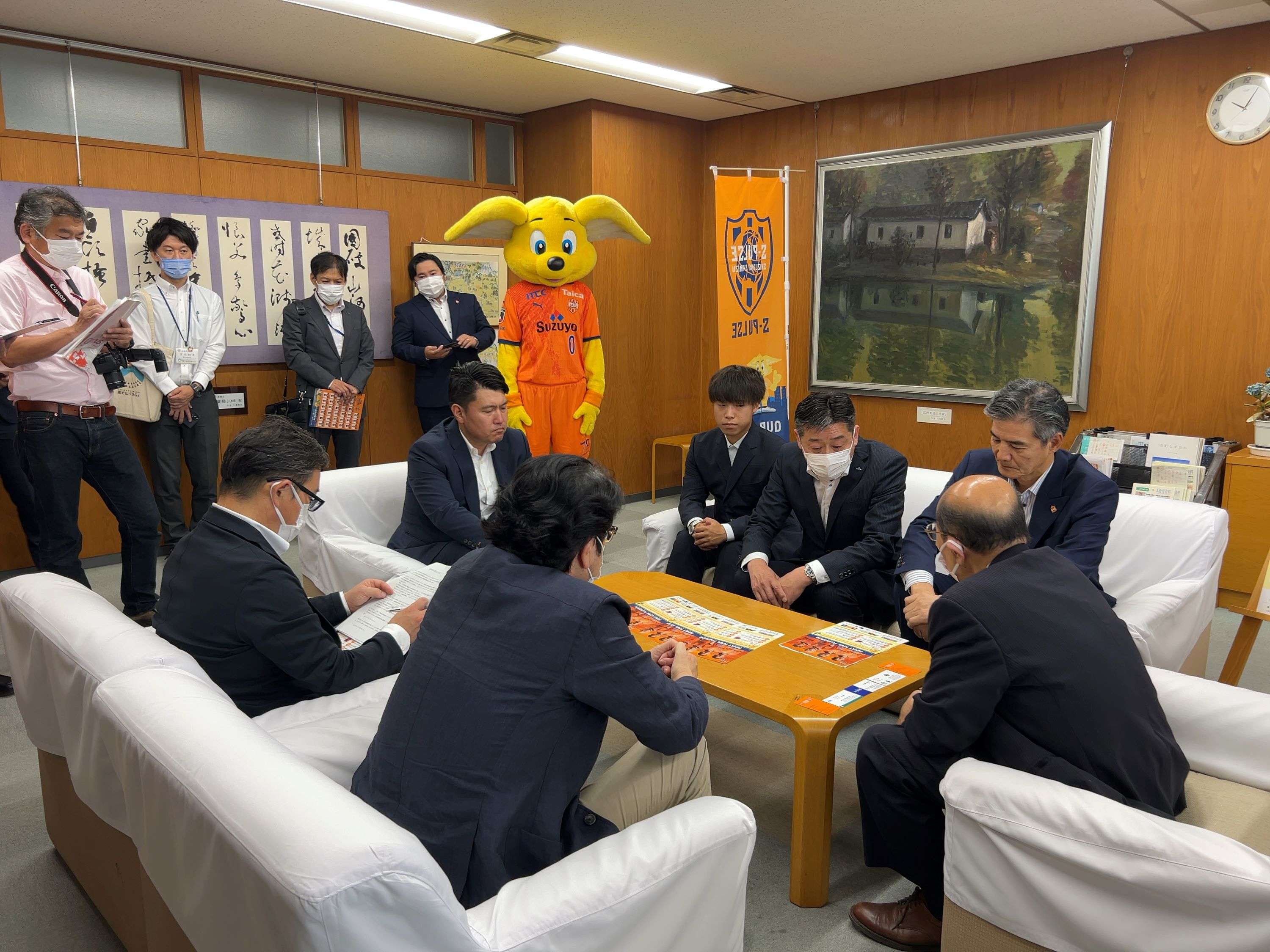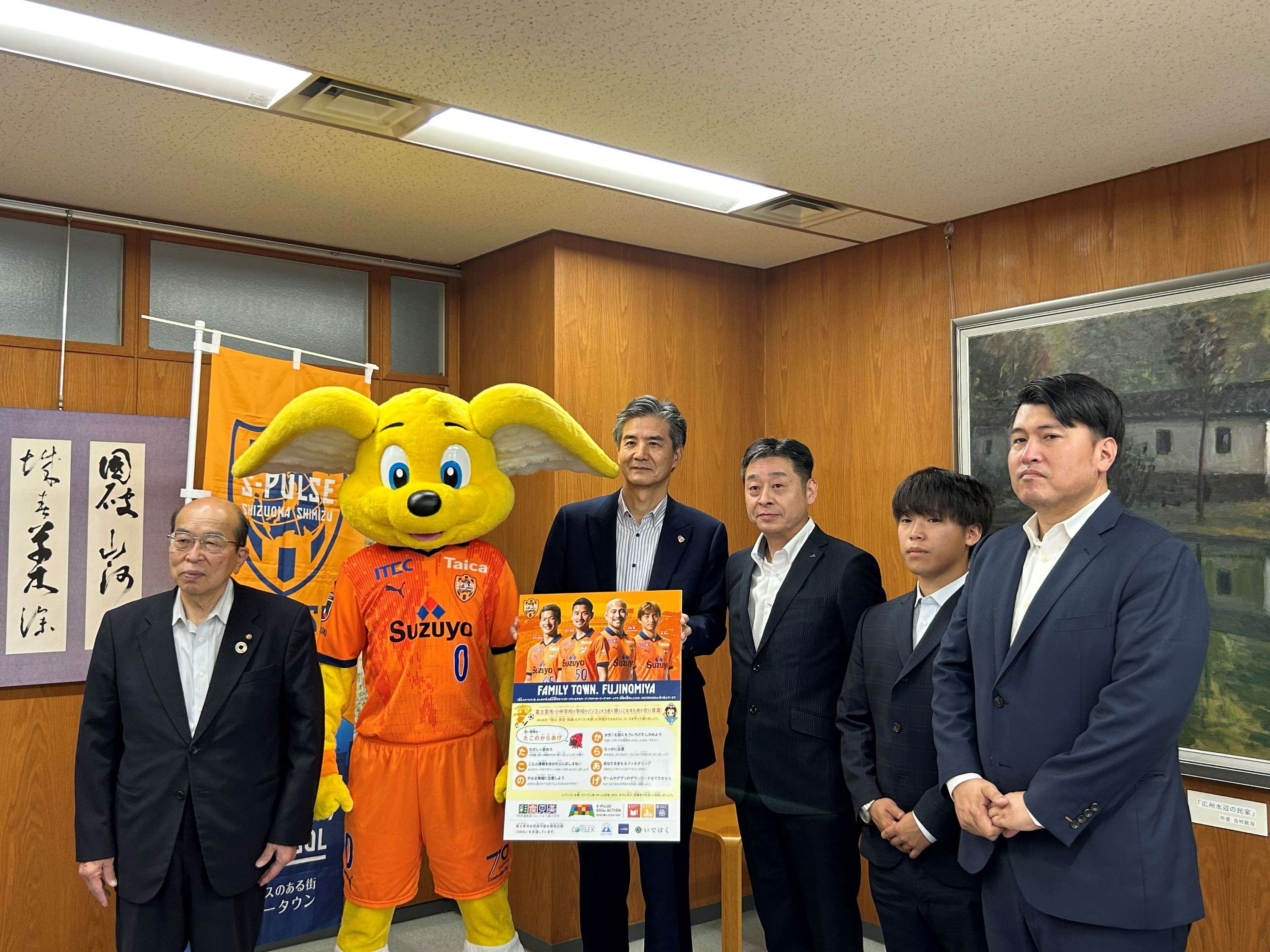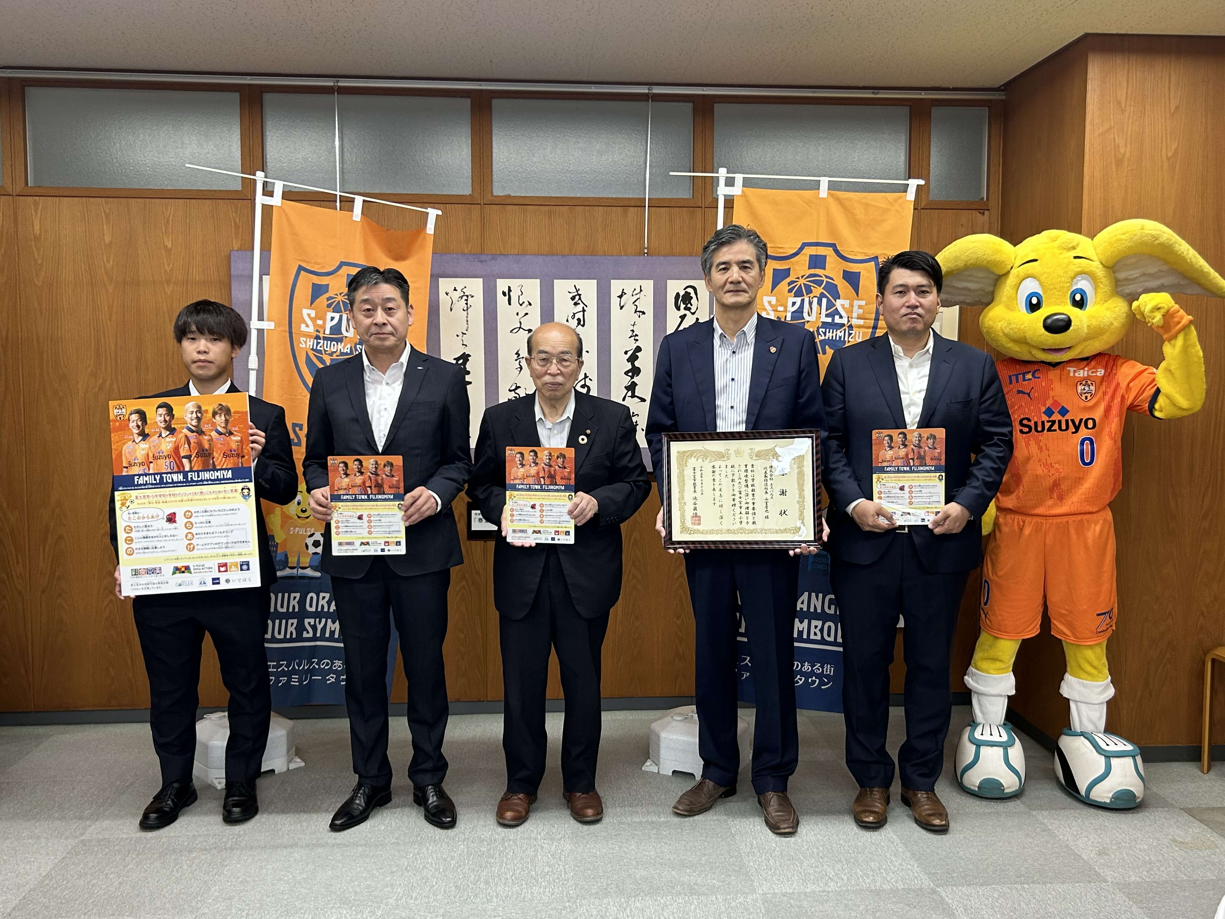 7月13日(木)富士宮市役所にて下敷きの贈呈式を実施し、株式会社エスパルス 代表取締役社長 山室晋也とオフィシャルマスコットのパルちゃんが参加しました。贈呈式にはご協賛いただいた企業の代表者様にもご出席いただき、富士宮市 池谷眞德 教育長へ下敷きの贈呈を行いました。