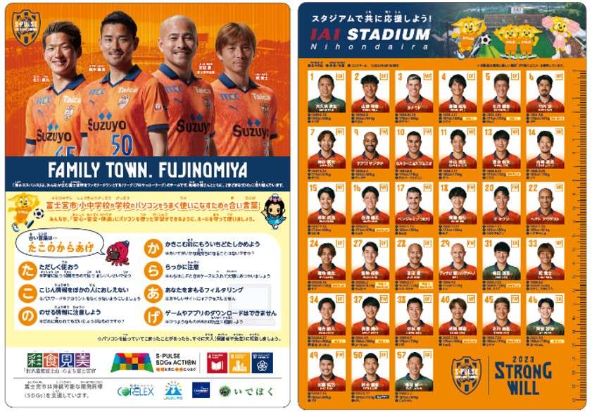 本事業は子どもたちにSDGsについて考えるきっかけをつくるとともに、クラブが取り組むスポーツ振興の一環として、地域愛の醸成、プロスポーツへの関心、心身の健全育成を目指すことを目的とし、下敷きの片面に安心・安全・快適なパソコンの使い方を、もう片面にはエスパルスの選手一覧を掲載しています。