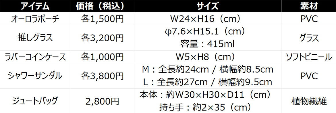 展開(オーロラポーチ、推しグラス、ラバーコインケース、シャワーサンダル)