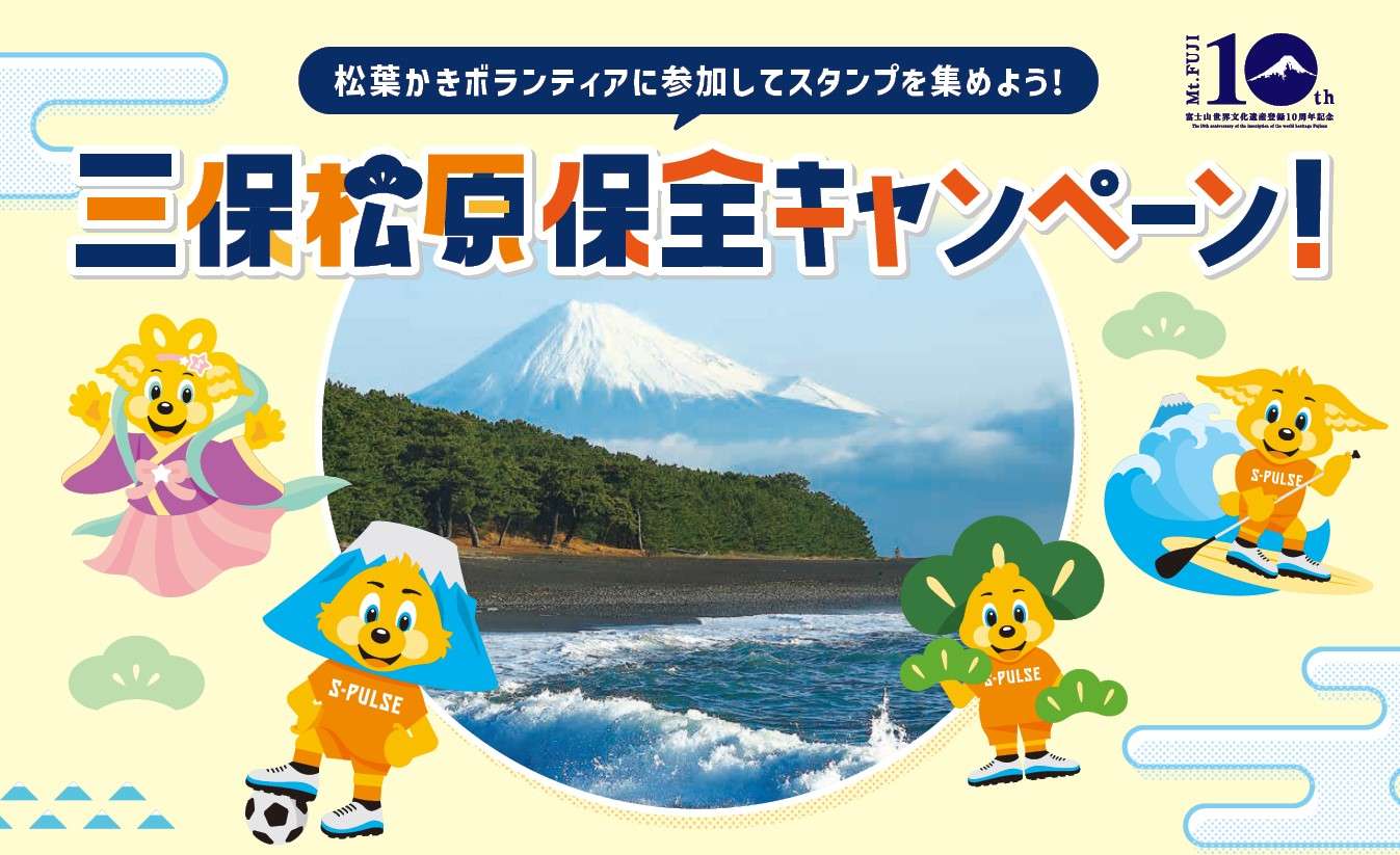 エスパルスは静岡市と連携して、本年6月に世界文化遺産登録10周年を迎えた「富士山」の構成資産「三保松原」の保全啓発活動を実施し、本活動の一環で『三保松原保全キャンペーン』を開催しております。松葉かきボランティアに参加してスタンプを集めた方に、三保松原パルちゃん オリジナルグッズをプレゼントし、スタンプがたまるとエスパルスグッズや観戦チケットが当たる抽選に応募いただけます。