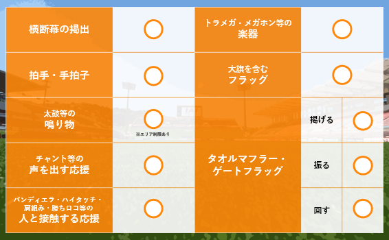 ※大旗の使用容認にあたって、対象エリアとなる席種では、フラッグにより一時的に視界を遮られるなどの場合がございますので、予めご理解、ご了承願います