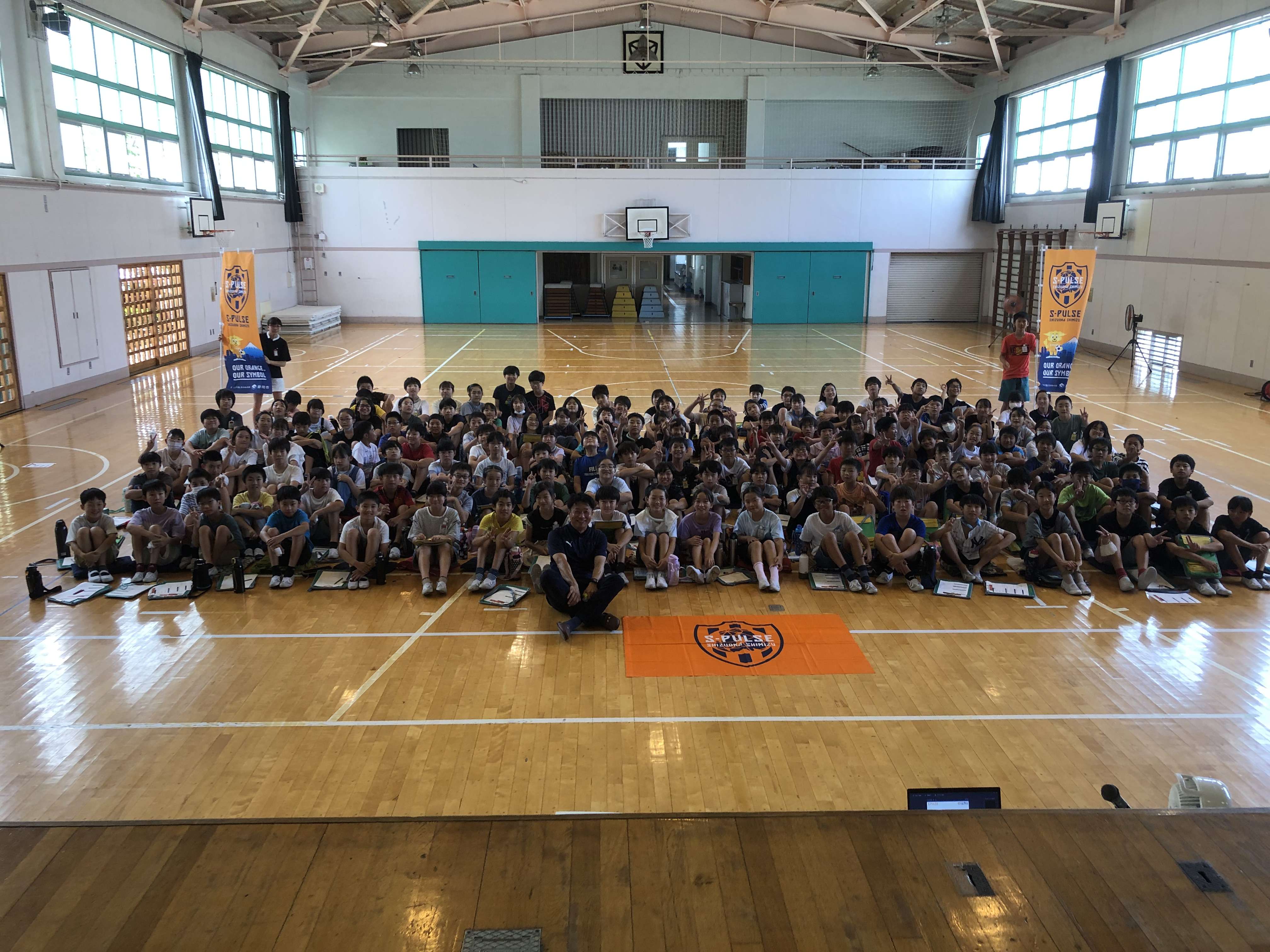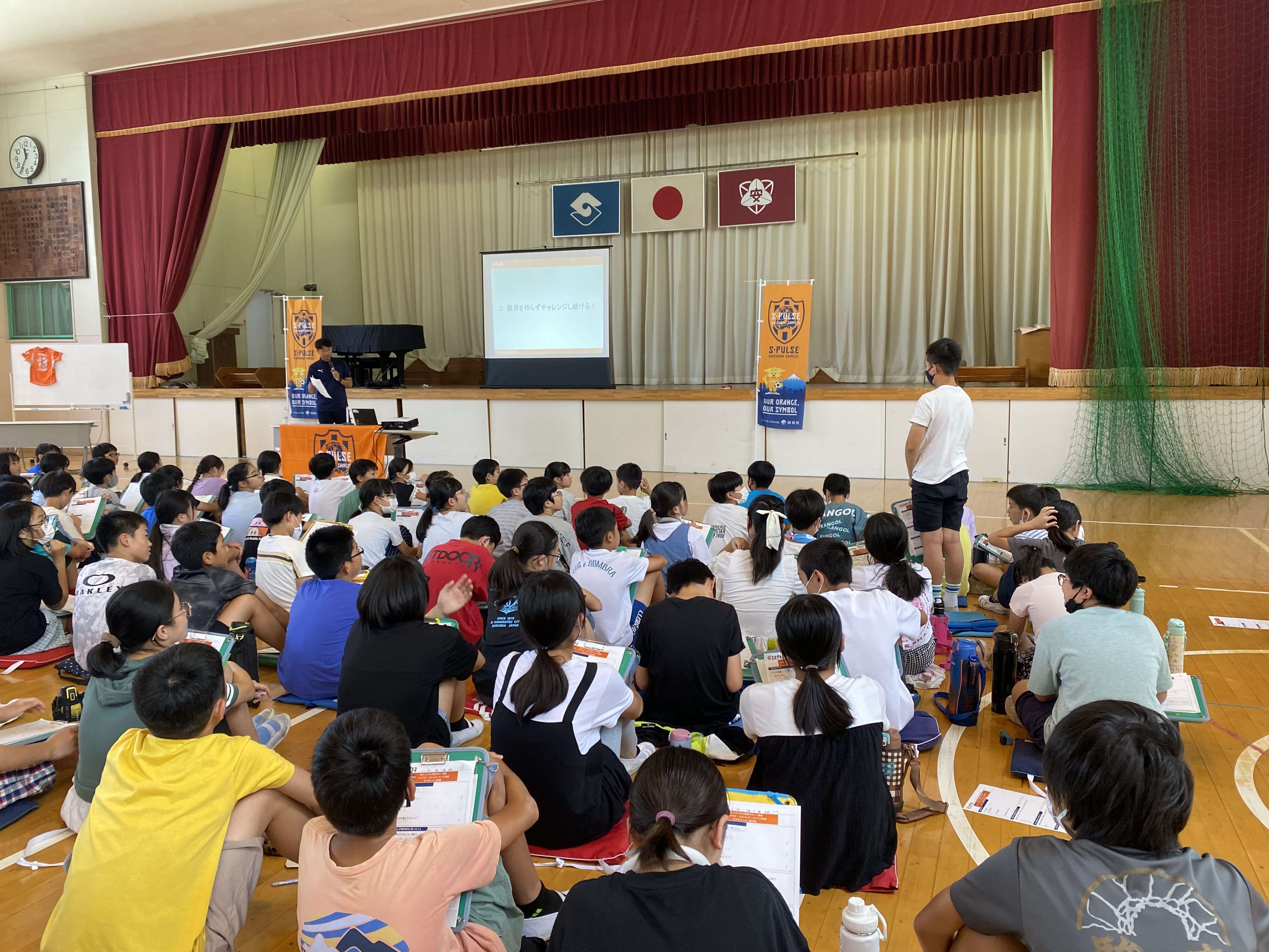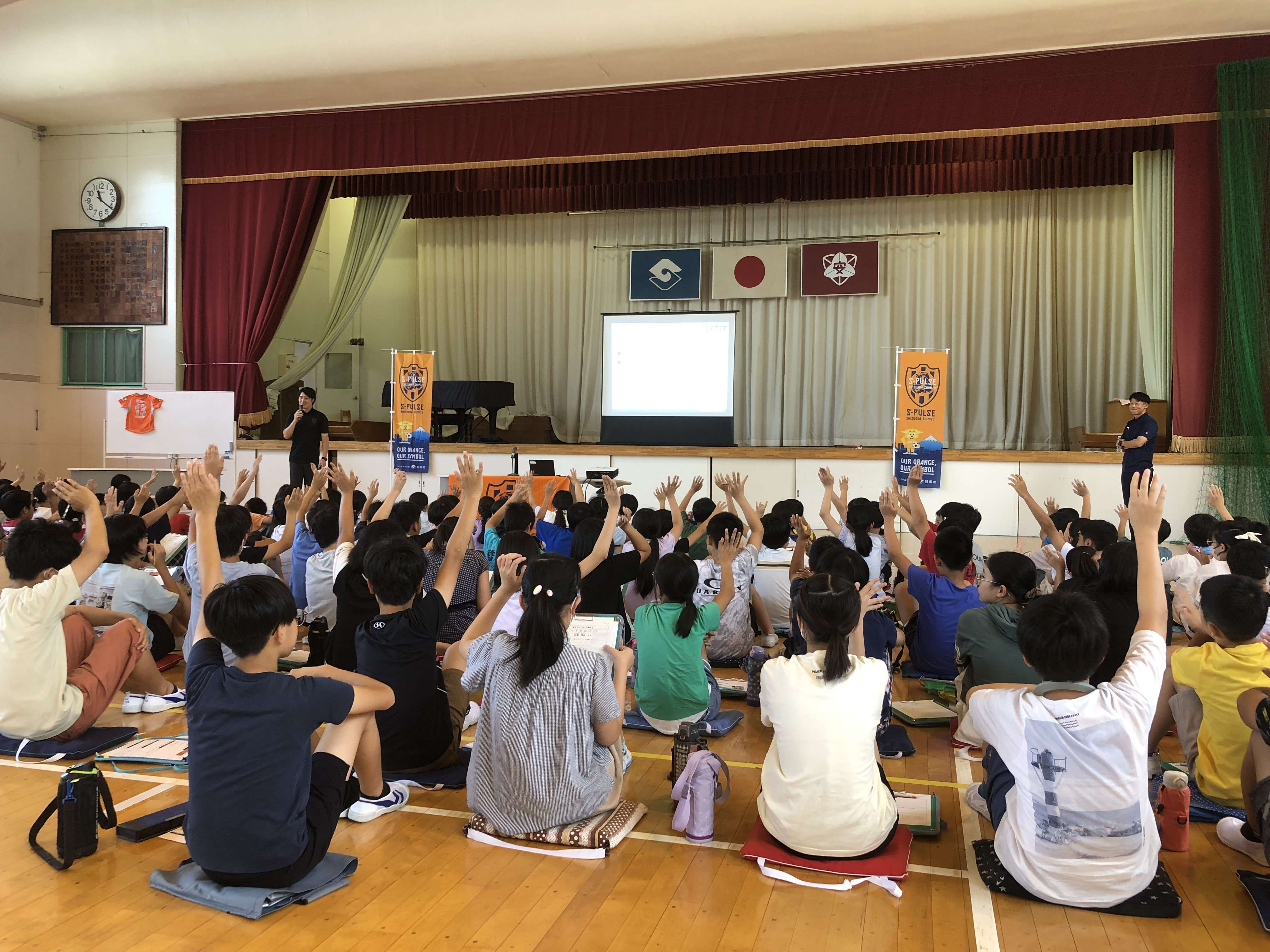 授業はエスパルスの簡単なクイズからスタート。「みんなエスパルス知ってる?」の問いかけには、全児童が手を挙げてくれました。