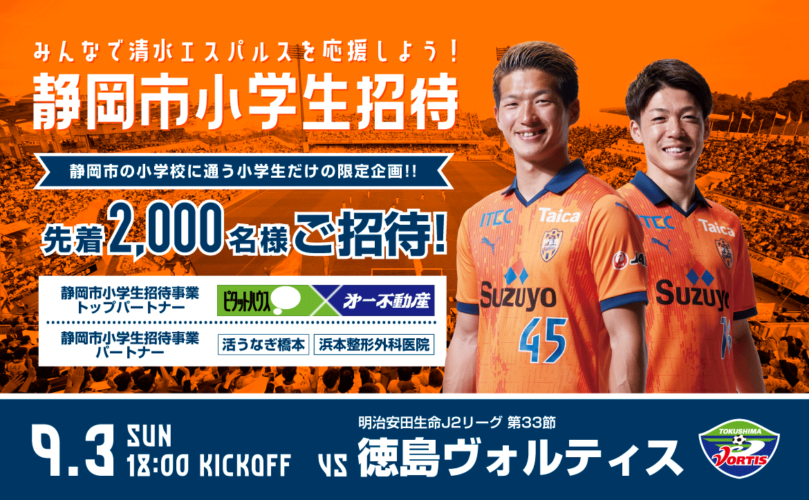 エスパルスは、静岡市の小学校に通う児童と保護者の皆様を対象に、ホームゲームへの招待企画を実施しますので、下記の通りお知らせします。本企画は、クラブが取り組むスポーツ振興の一環として実施するものです。エスパルスのチーム・選手を身近に感じ、またJリーグの楽しさを体感してもらうことで、少年少女の健全育成に貢献することを目的として行います。