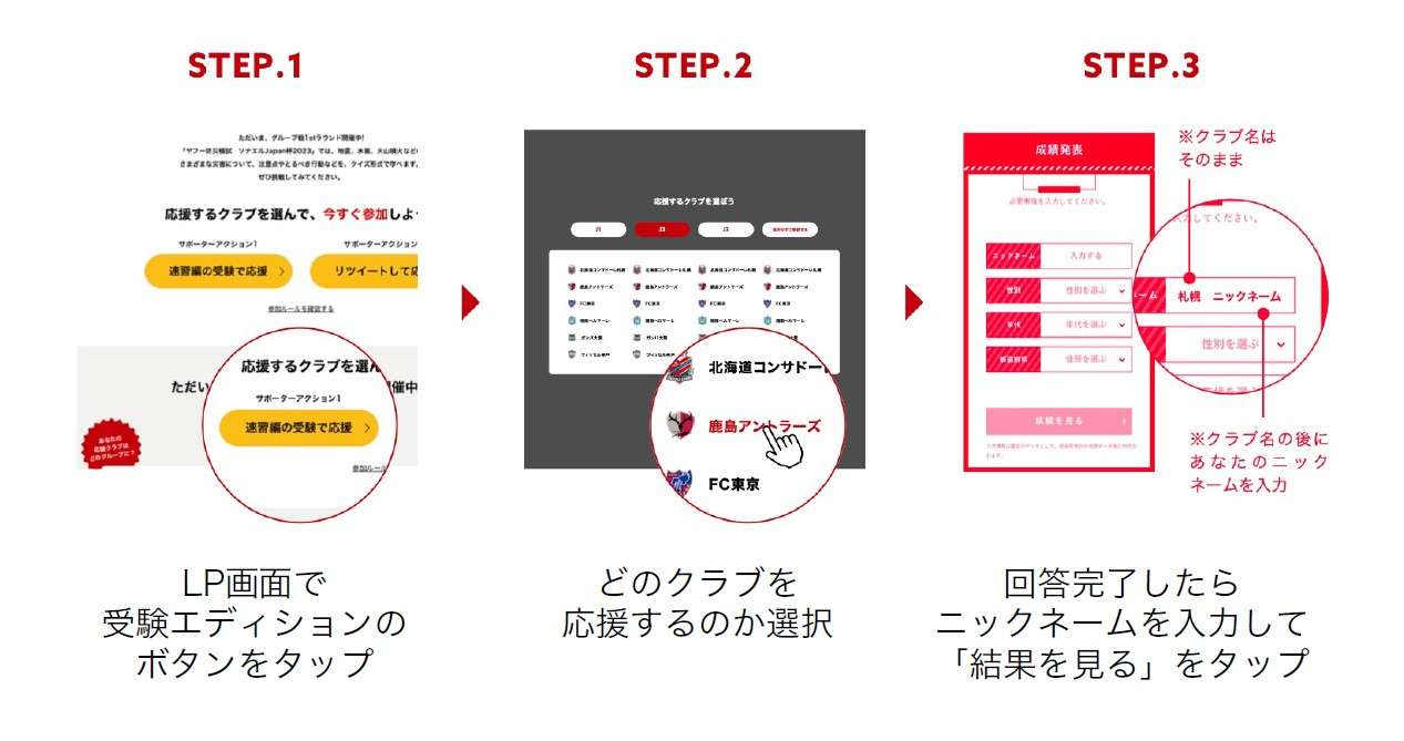 ソナエルJapan杯はサポーターのアクションによって応援するクラブに勝ち点が付与され、その合計得点で勝敗が決定します。勝ち点を獲得するアクションは以下の3つです。