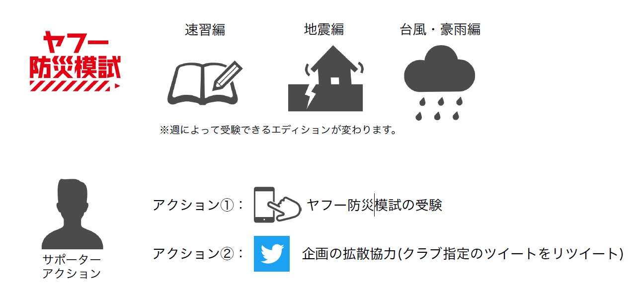 今年もヤフーとJリーグシャレンは災害の被害を少しでも減らしたいという想いから、協働で「ヤフー防災模試 ソナエルJapan杯」を開催し、防災知識・意識の向上を目指しております。ヤフー防災模試を受験して、防災・災害に関する知識を身に付けながら、清水エスパルスをNo.1クラブへ導きましょう。