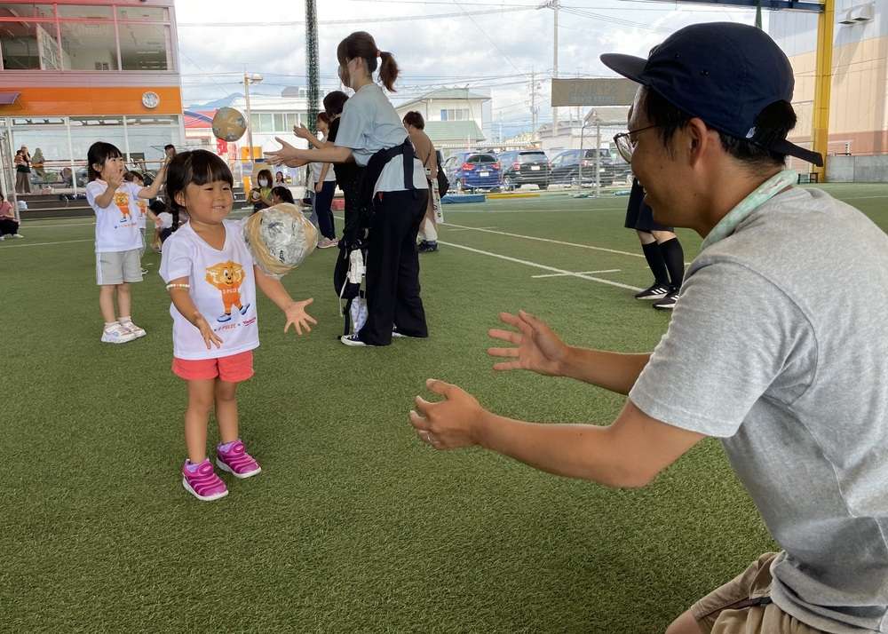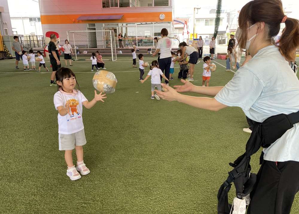 作ったボールを「なげる」・「とる」といった動作を必要とするキャッチボールや、ボールを「ける」・「わたす」動作が主となるシュート練習などを行います。最後はボールを使ったサッカー対決を親子で実施し、ゲーム形式の中で楽しく運動する機会を創出します。
