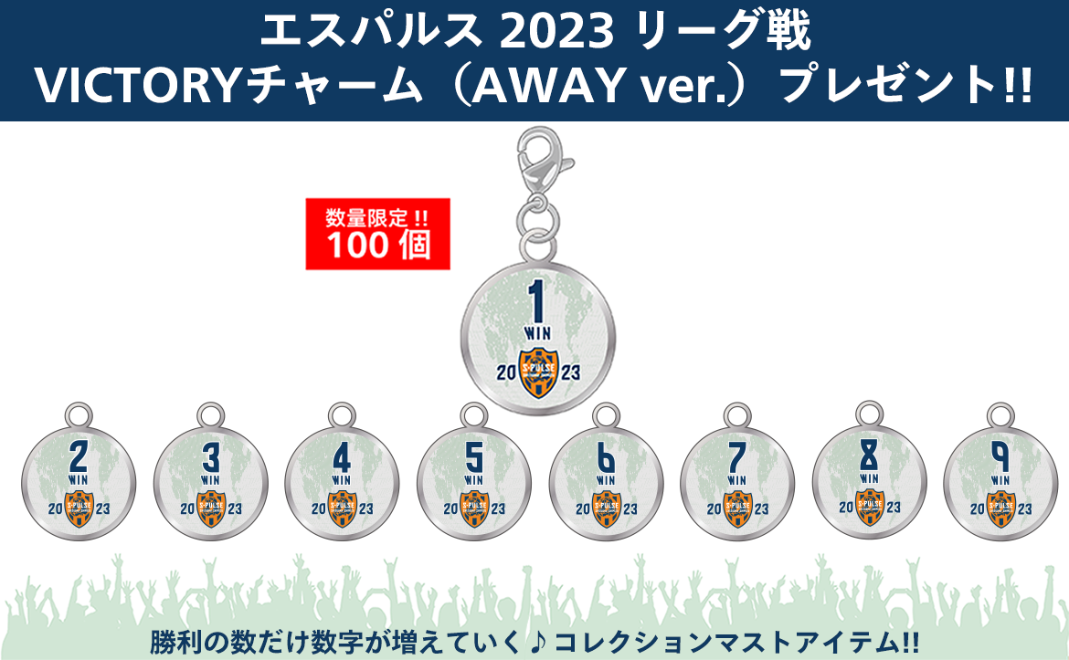 9/17(日)の明治安田生命J2リーグ 第35節ツエーゲン金沢戦(AWAY)に勝利した場合、翌々日S-PULSE STORE清水店にて3,000円(税込)以上ご購入で「VICTORYチャーム(非売品)」を先着でプレゼントいたします。VICTORYチャームの表面には2023シーズン アウェイゲームの勝ち星の数字がデザインされます。