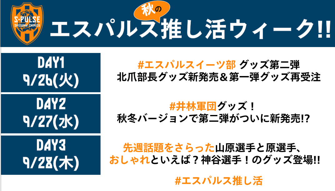 秋の気配を感じる9月の最終週、【秋のエスパルス推し活ウィーク】として、下記日程で本日より3日間、推し活グッズ各種を発売します!!
