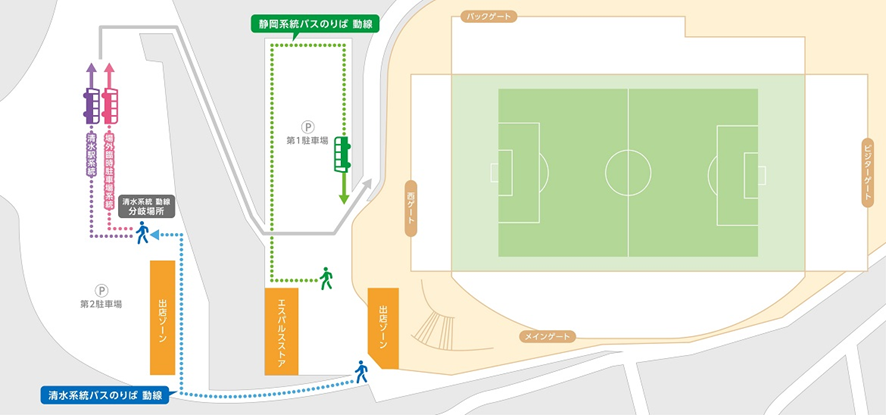 『清水駅系統 清水駅-スタジアム直行』と『清水駅系統 清水駅-波止場フェルケール博物館(浪漫館前)- 宮加三橋-スタジアム行』と『静岡駅系統 静岡駅-スタジアム直行』を運行しております。