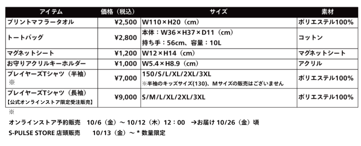 ※プレイヤーズTシャツはエスパルス公式オンラインストアにて、10月6日(金)~10月12日(木)正午12時までの予約受付となります。サイズごとに数量限定となりますので、上限に達し次第予約販売を終了いたします。なお、プレイヤーズTシャツ(半袖)については、10月13日(金)より、S-PULSE STOREにて数量限定で店頭販売いたします。
