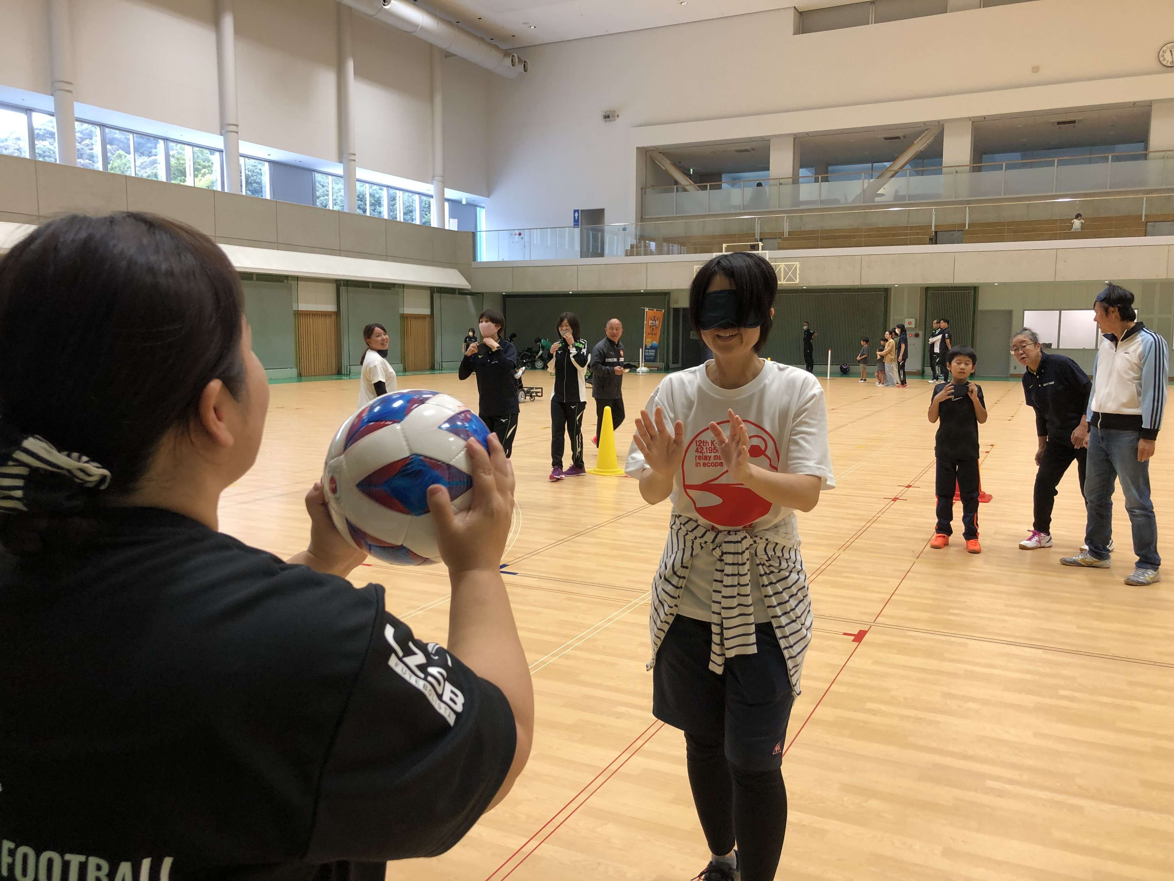 後半は、障がい者サッカー体験。ブラインドサッカーでは、アイマスクをして音のなるボールを耳だけを頼りに恐る恐る前へ進んだり、電動車いすサッカーでは、選手の皆さんのデモンストレーションの後に実際に車いすに乗る貴重な体験をしましたが、思い通りに進むことが出来ずに思わず苦笑い。アンプティサッカーでは、片足だけで専用の杖を使っての体験中に、なかなか馴染めずつい両足を使っていました。
