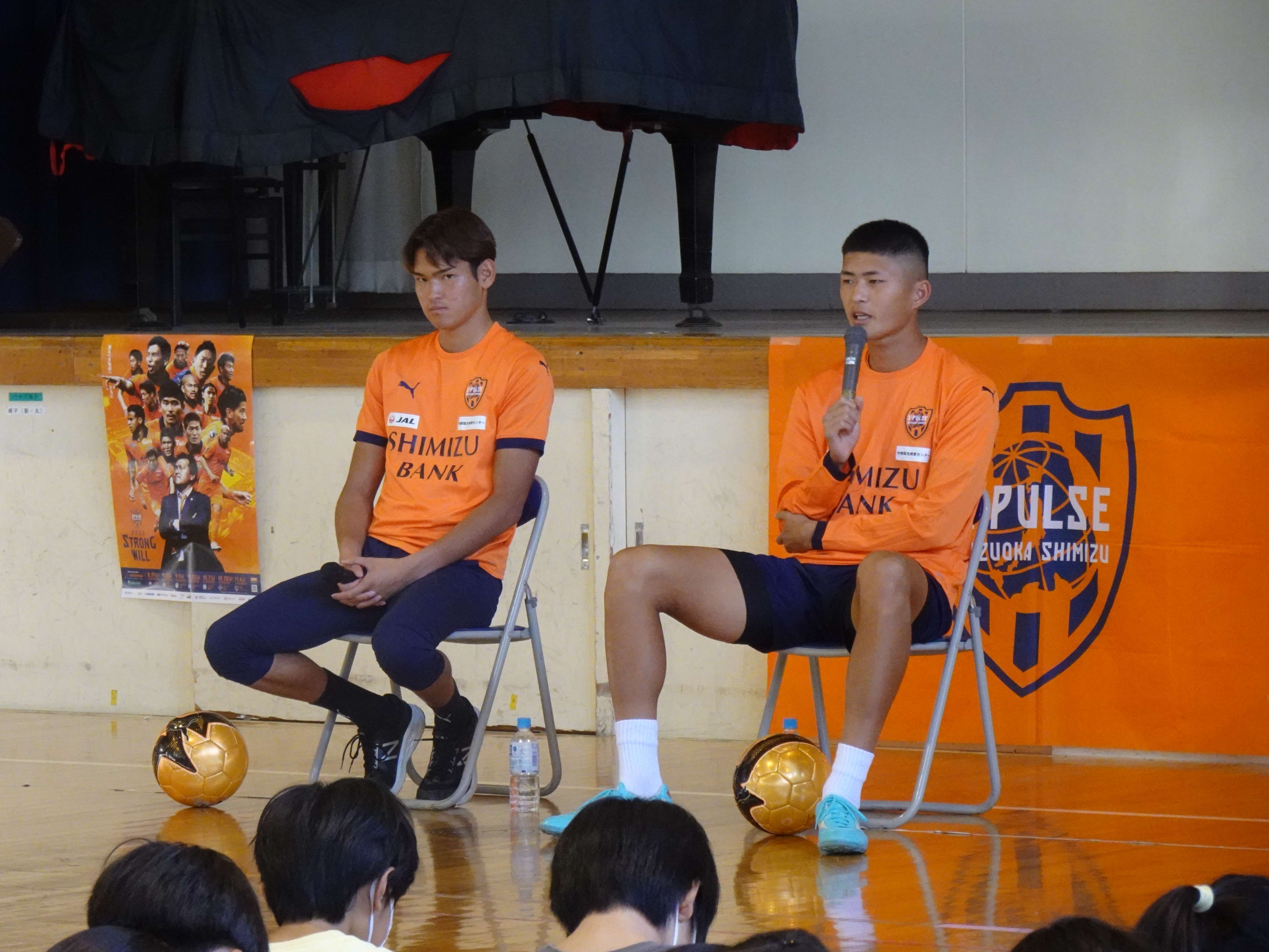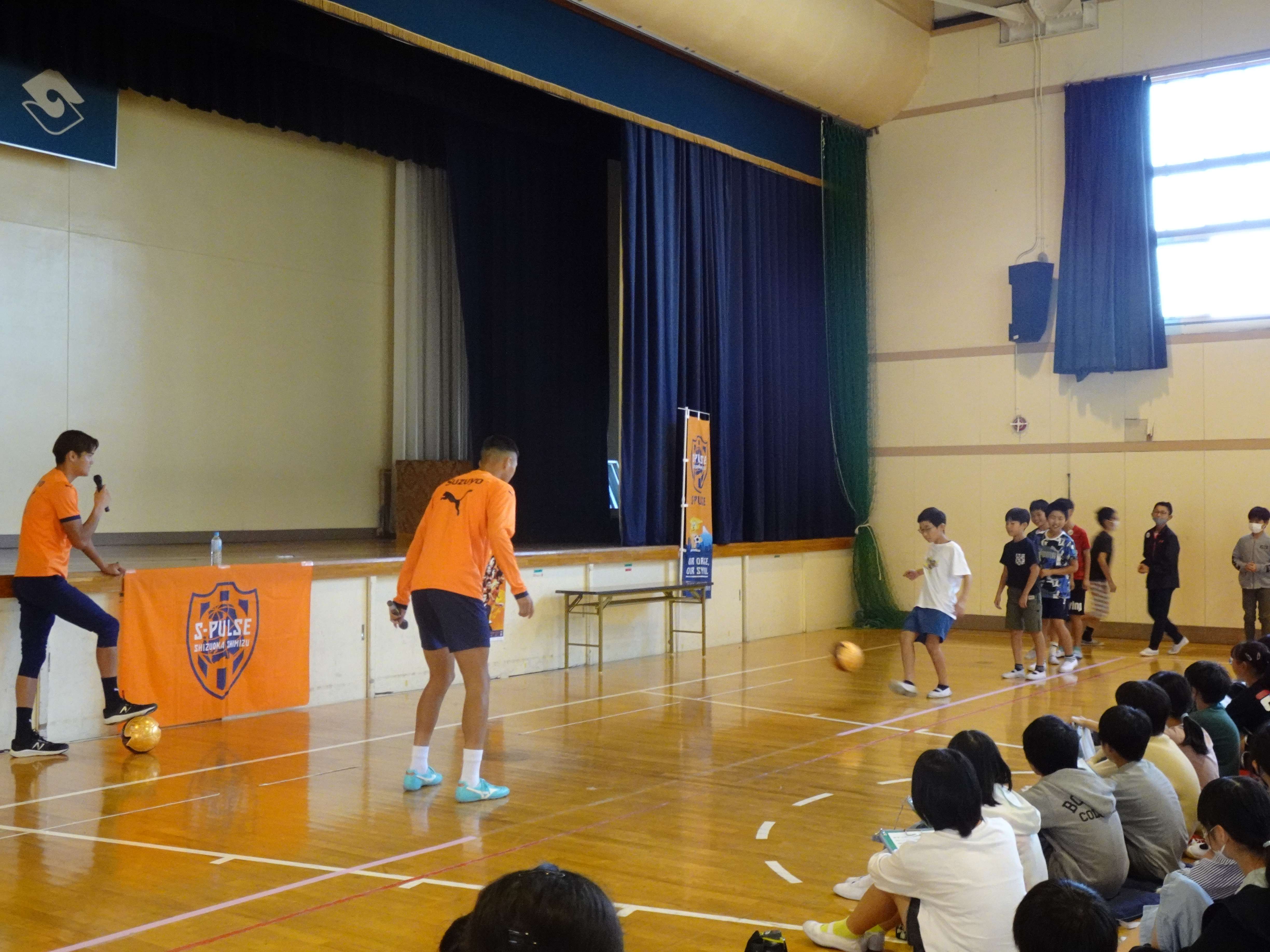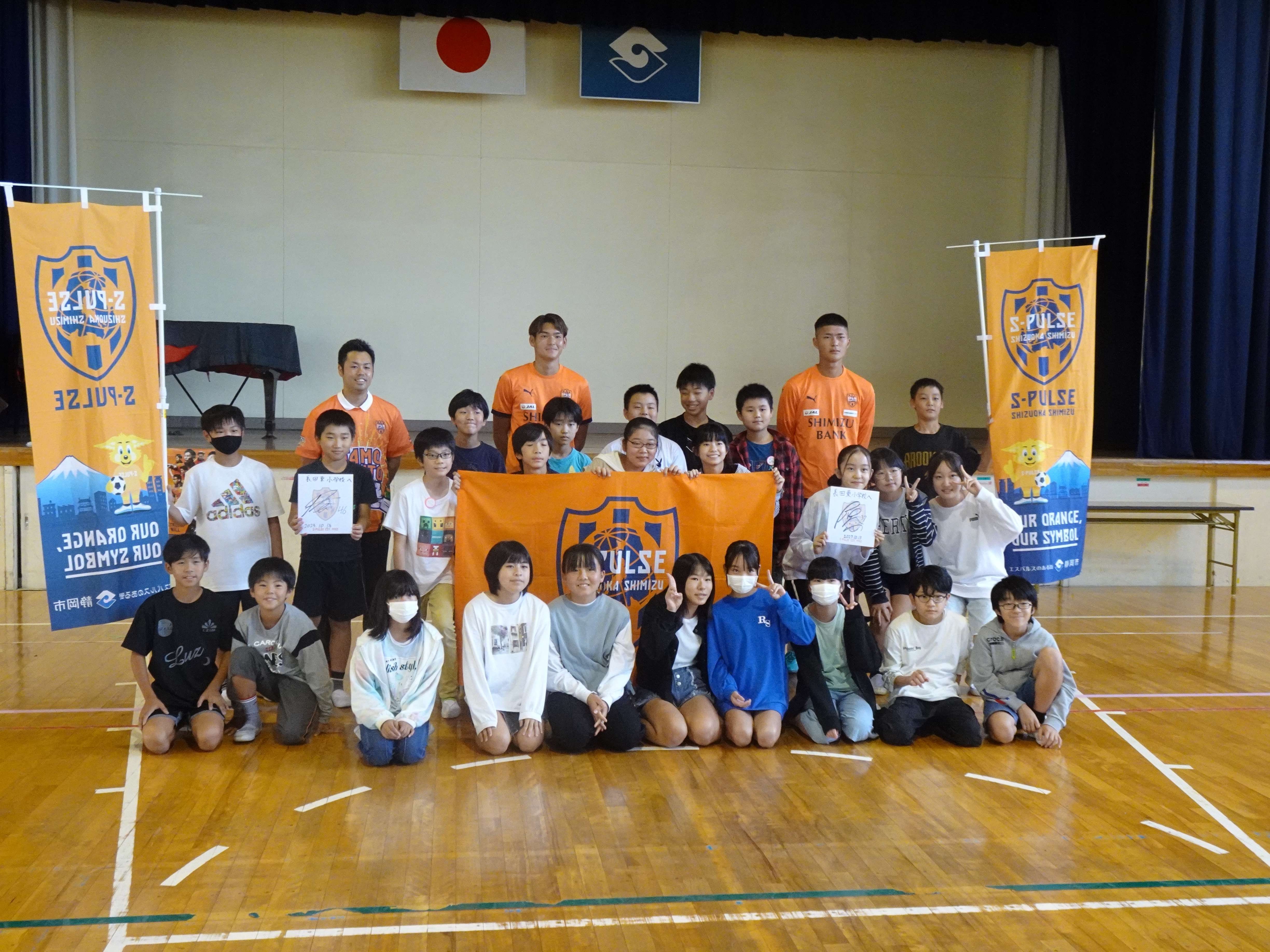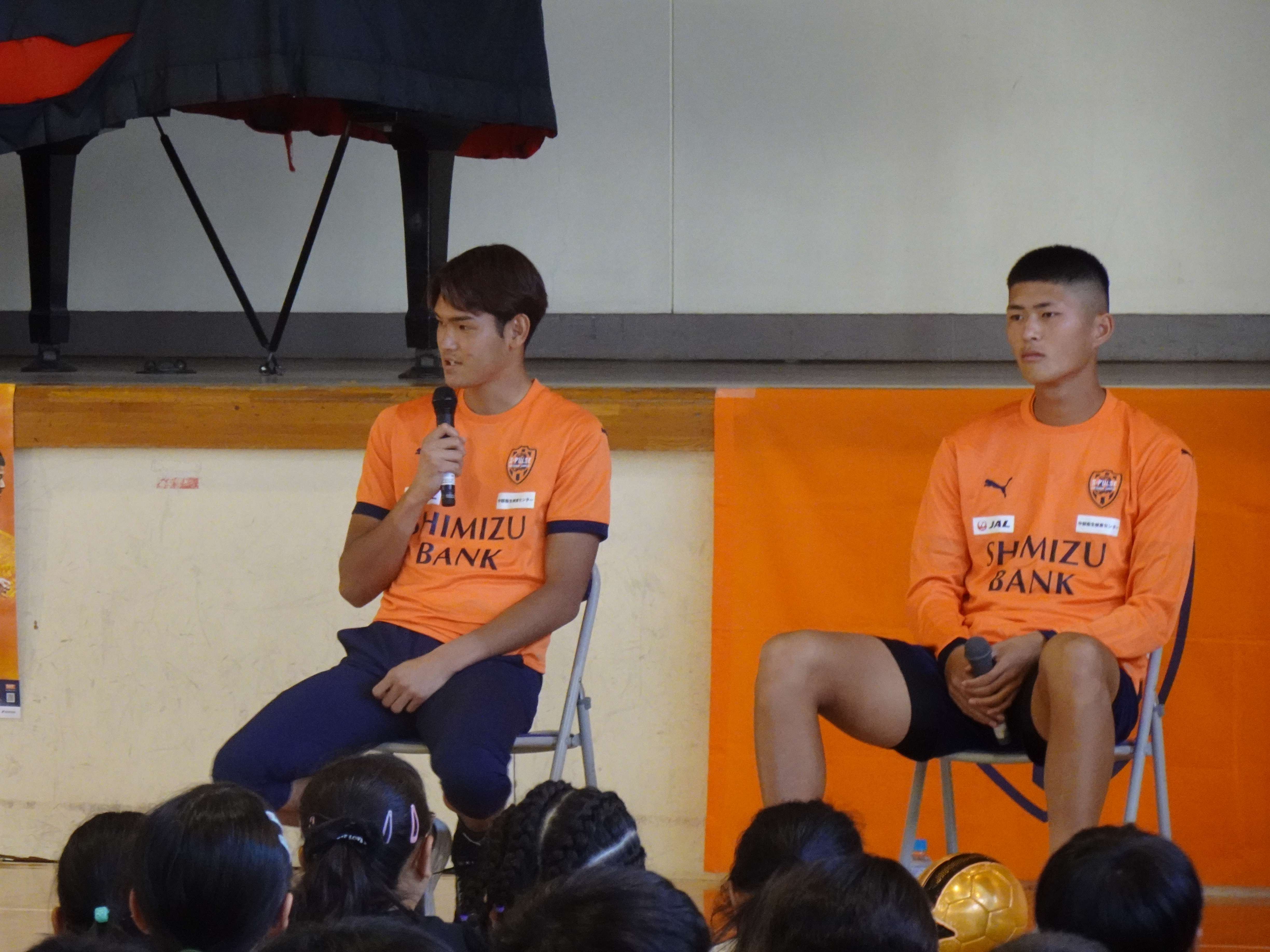 10/13(金)エスパルスが実施するホームゲーム招待企画『静岡市小学生招待事業』の御礼とキャリア教育授業実施のため、阿部諒弥選手、森重陽介選手がホームタウン静岡市の静岡市立長田東小学校(6年生150名)を訪れ、交流を深めました。