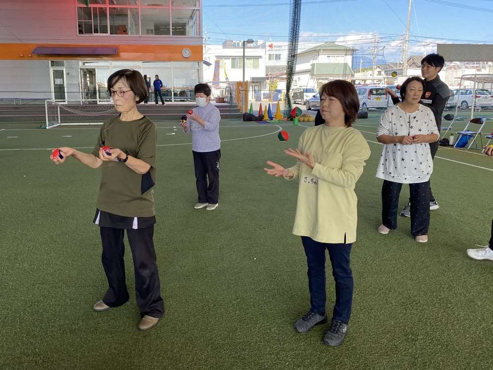 まずはお手玉にチャレンジ。左右で高さを変えながらキャッチする動作や、手をクロスしたりクロスする手の上下を逆にするなど徐々に複雑な運動を実践し身体と同時に脳にも良い刺激を入れていきます。