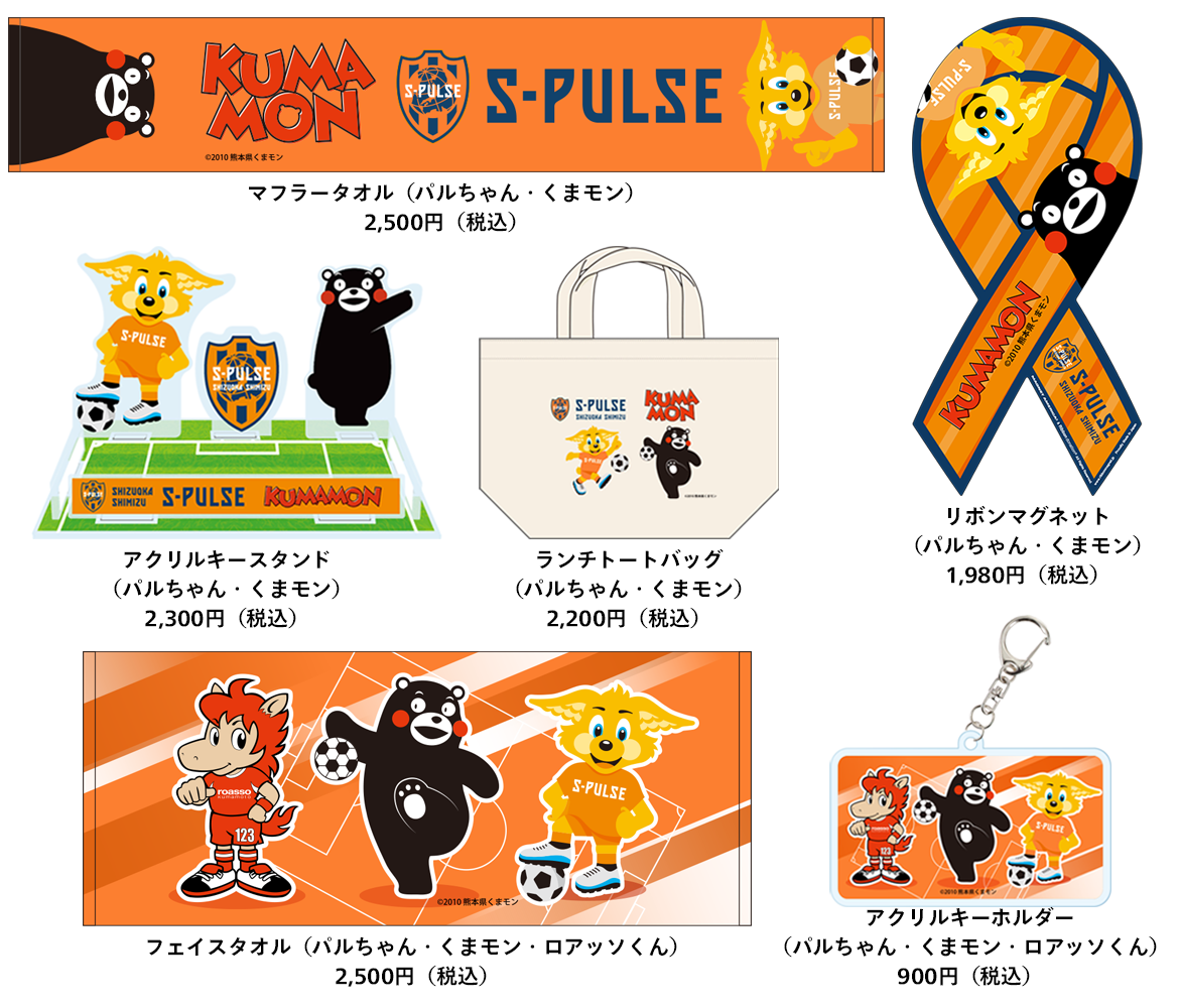 10/28(土)の明治安田生命J2リーグ 第40節ロアッソ熊本戦に際し、10/27(金)より、大人気ご当地キャラ、熊本県の営業部長兼しあわせ部長「くまモン」と、エスパルスの愛されキャラ、われらが「パルちゃん」をデザインしたグッズをエスパルス公式オンラインストア、S-PULSE STOREにて販売いたします。またフェイスタオル、アクリルキーホルダーにはロアッソ熊本のマスコット「ロアッソくん」もデザインしておりますので、ぜひお買い求めください。