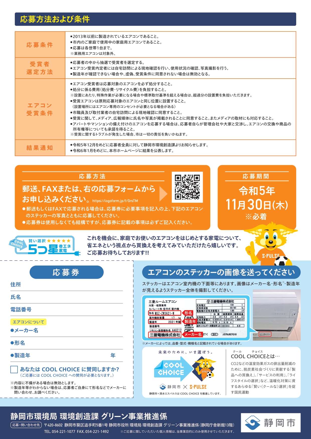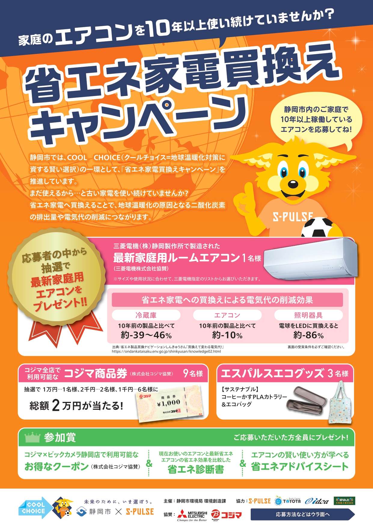 清水エスパルスは静岡市と連携し、また地元企業様にご協力いただき、環境省が推進する地球温暖化対策『COOL CHOICE』の啓発活動を実施しています。本活動の一環として、静岡市内のご家庭で10年以上稼働しているエアコンを応募いただくキャンペーンを実施いたしますので、お知らせします。