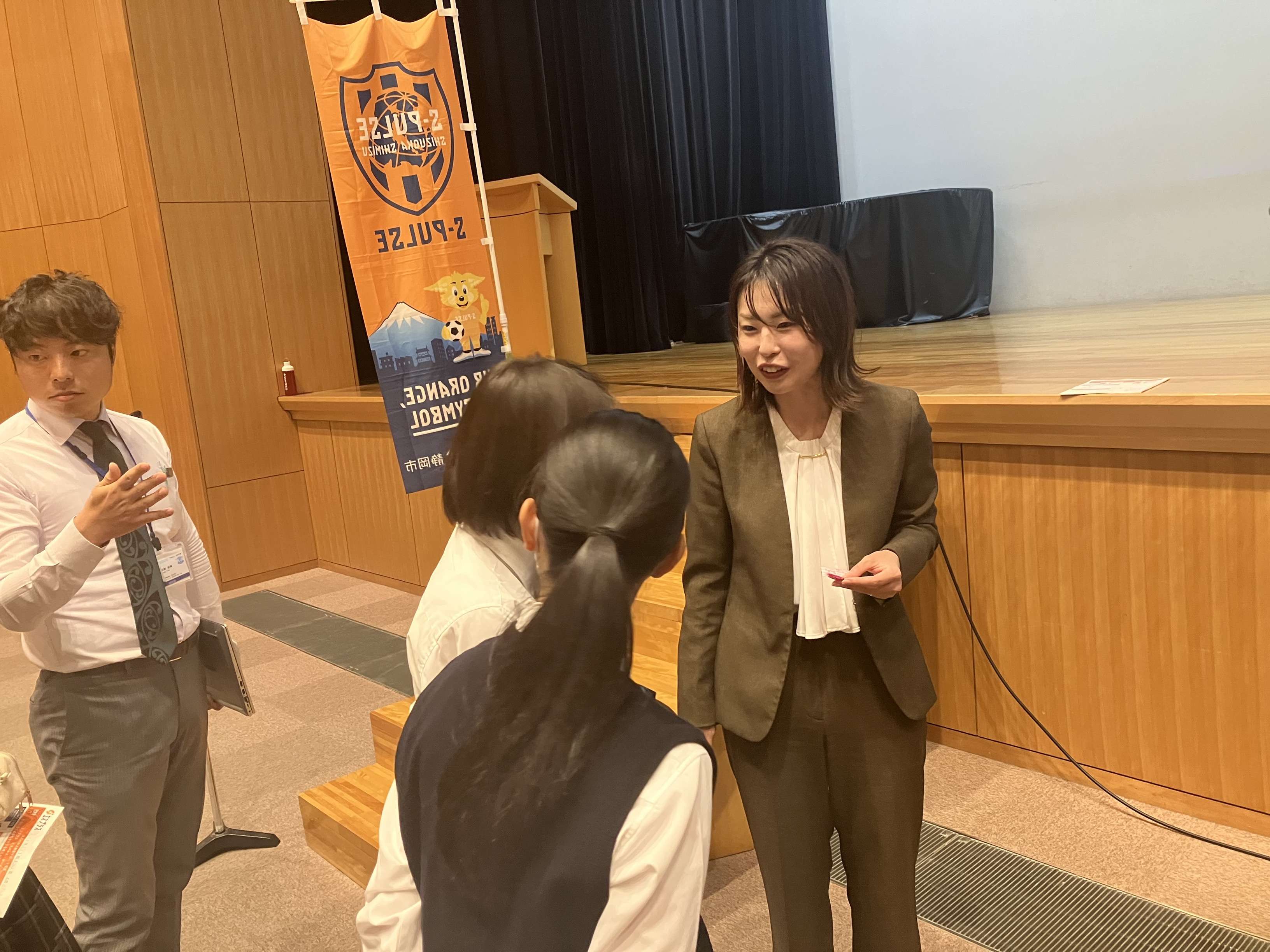授業のはじめに、エスパルスのマスコットキャラクターや選手についてのクイズを行いました。エスパルスに興味を持っている生徒も多く、すぐに答えが出てきました。その後エスパルスとパートナー企業、地域とのつながりなどを紹介。そして、セイリン株式会社の構内営業部、営業課の小林千尋さんをゲスト講師に迎え、「仕事をする時に必要なチカラや大切にしていること」について学びました。パートナー企業としてエスパルスとどのように関わっているか、また小林さんが仕事をする上で「必要なチカラ」は何かなど、分かりやすくお話していただきました。
