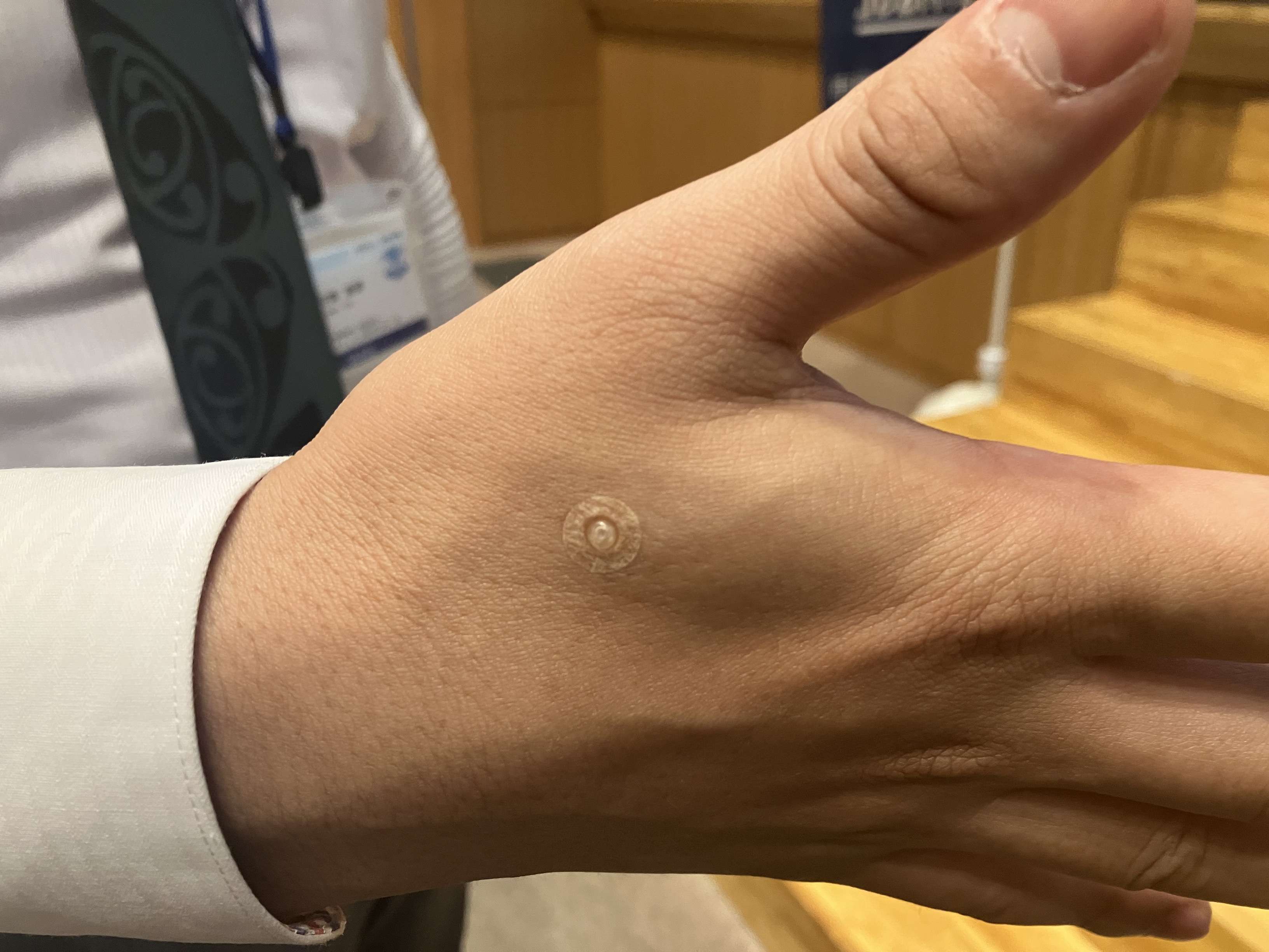 セイリンでは、治療で使われる鍼を作っています。人の体には361個のツボ(経穴)があり、鍼を打つことで血の流れがよくなり体が元気になります。また、セイリンは世界初の使い捨ての鍼を販売し、日本だけでなく、世界でも使用されています。今回は、ツボや鍼の体験として、教員2名にセイリンの商品である『こりスポッと』を体験していただきました。肩の痛いという安齋先生は肩に貼るのではなく、肩に関係する手のツボに貼りました。安齋先生は「貼ったのが全く分からなかったです。」と痛みは全く感じなかったようです。野田先生は神門というツボに貼り、「リラックスできました」と効果を実感できたようです。生徒たちも安齋先生や野田先生と同じツボを手で刺激し、ツボの効果を試しながら話を聞いていました。