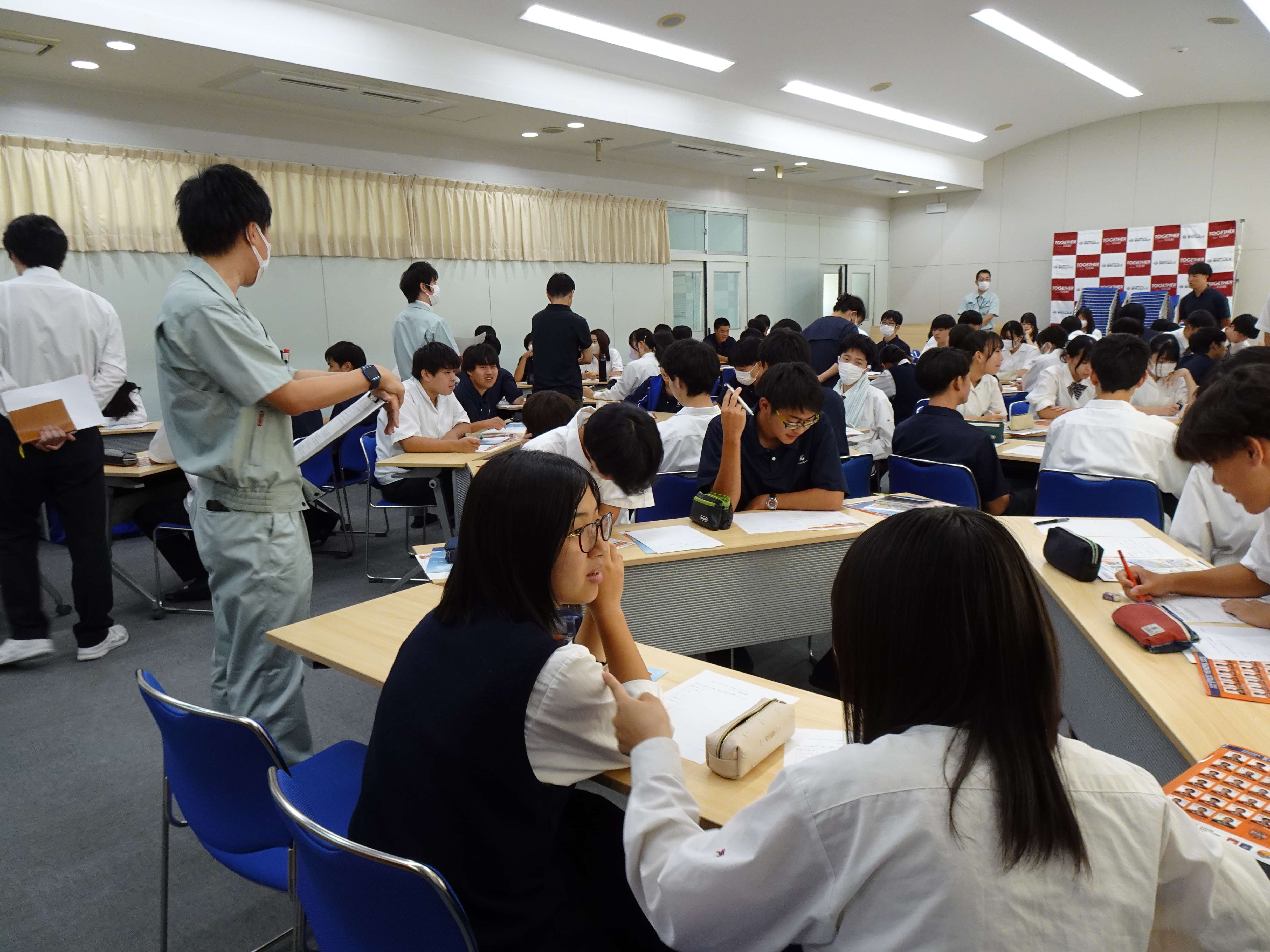 グループワーク後には、稲葉さんと菊元さんが今の仕事で一番重要としているチカラについて話をしました。稲葉さんは、「製品を作る上で一番最初に仕事をするのは設計です。設計が主体性をもって取り組まないと期限に間に合わず、お客様に製品を届けることができません。今回のグループワークでも主体性がないと進められなかったと思います」と学校生活での主体性の大切さを教えてくれました。菊本さんは、「皆さんが新品で購入したものは不良がないと思います。それは、私のような検査をする人が、問題がないか確認をするからです。使用する人の立場でものを見るように心掛けています」と課題発見力の大切さを伝えてくれました。