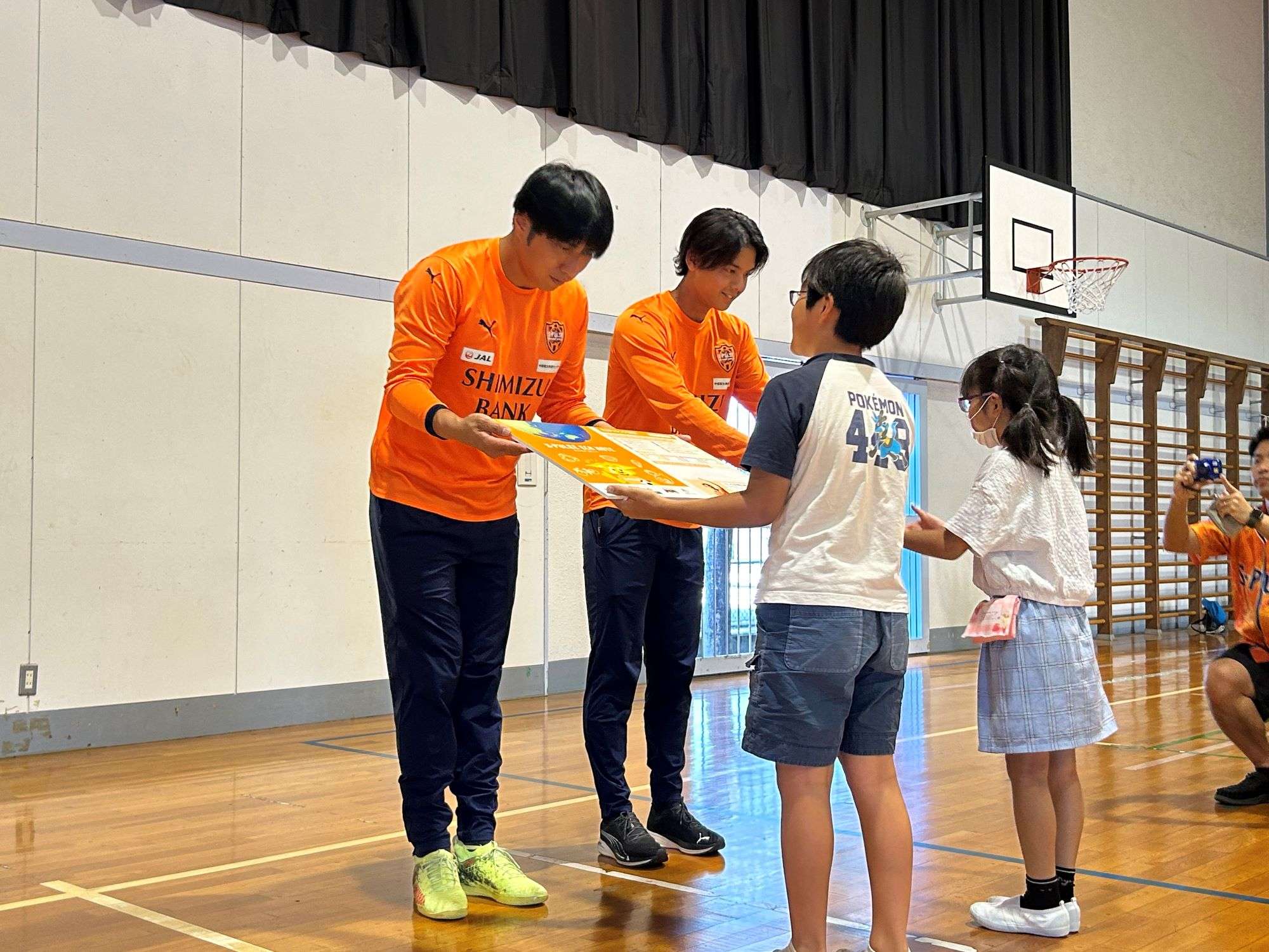 10/12(木)静岡市立森下小学校にて静岡市とエスパルスが実施した『COOL CHOICE環境教室』にて、大久保択生選手と菊地脩太選手より代表児童へ贈呈を行いました。
