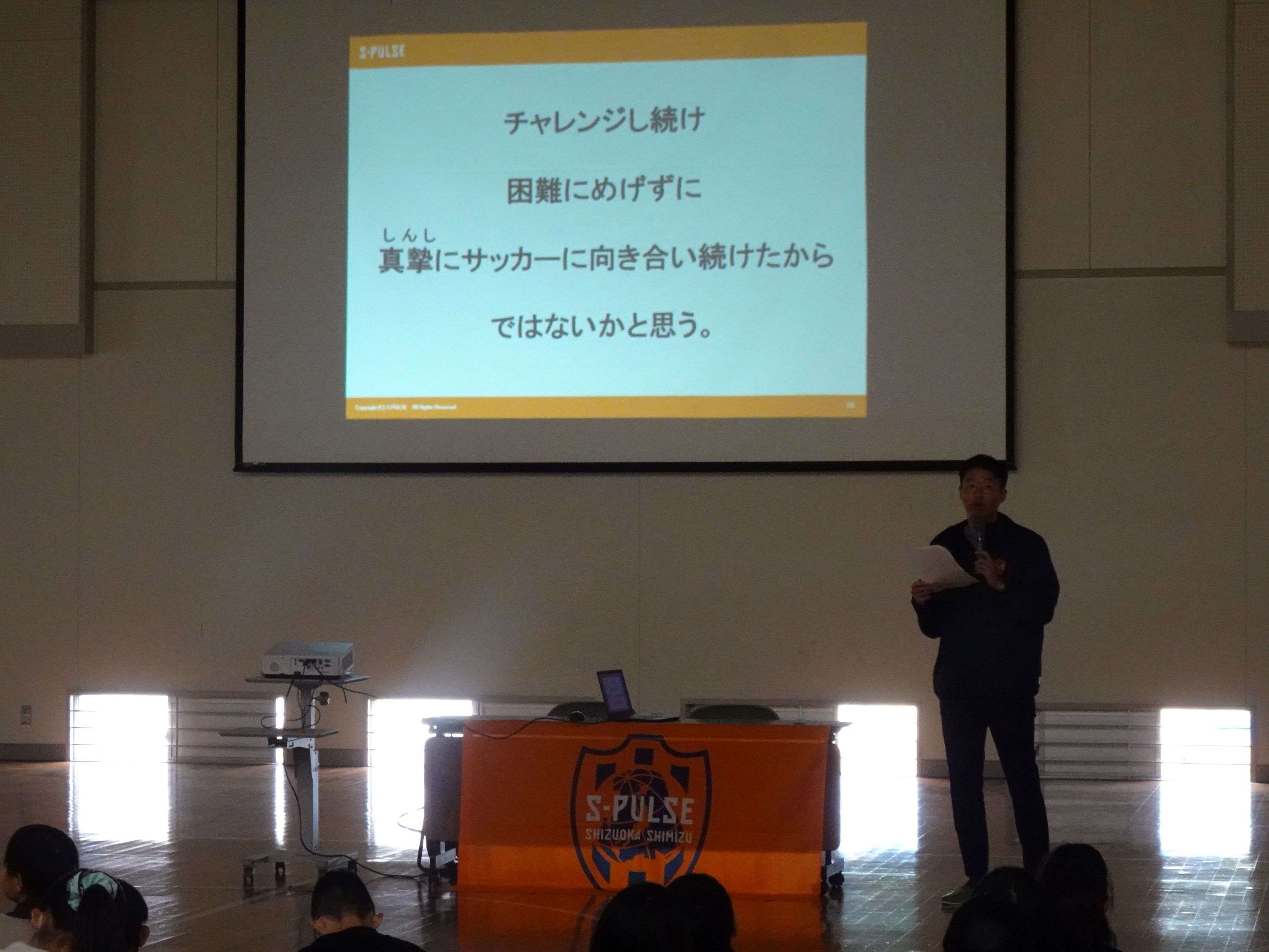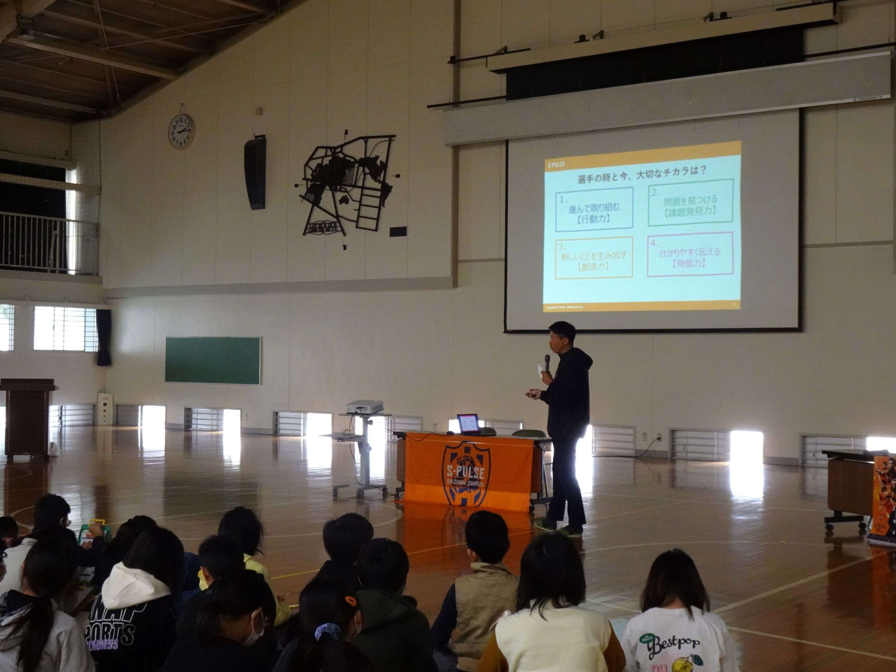 今回の授業は、ファミリータウン富士市にて富士市立今泉小学校6年生85名を対象に清水エスパルス スカウト部の兵働昭弘が講師となり『エスプラス 富士市版~元プロサッカー選手編~』のキャリア教育授業を実施しました。