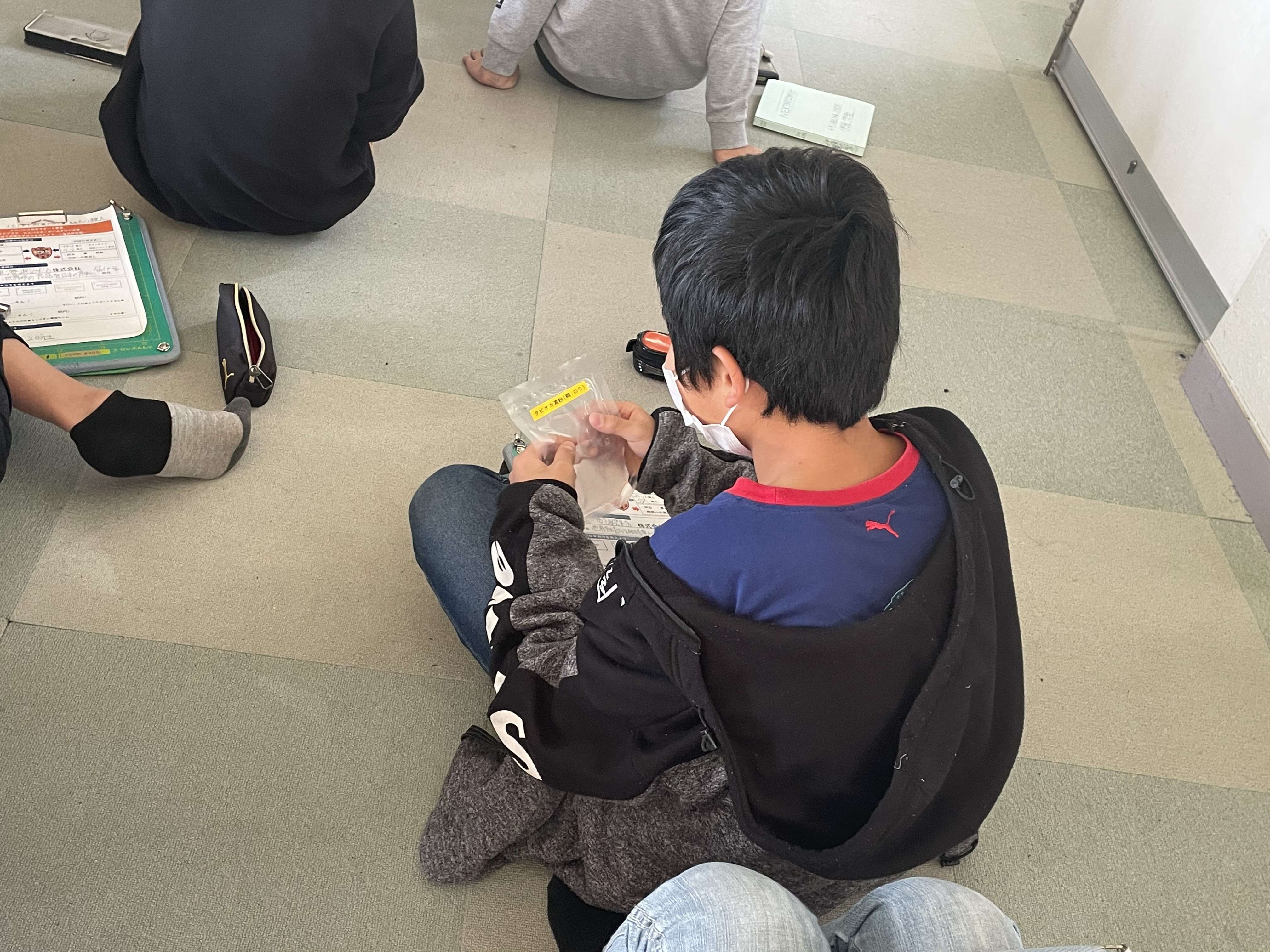 また、澱粉の原材料には、日本で栽培することのできないものもあり、世界のいろいろな国から輸入されていることなどの説明を聞きながら、生徒たちは、実際に澱粉に触れながら学びました。これからの時代に、環境に配慮した食品が求められていく中で、東海澱粉が取り組むSDGsについてもタイの工場の実践例の話を、児童たちはメモを取りながら真剣に聞いていました。