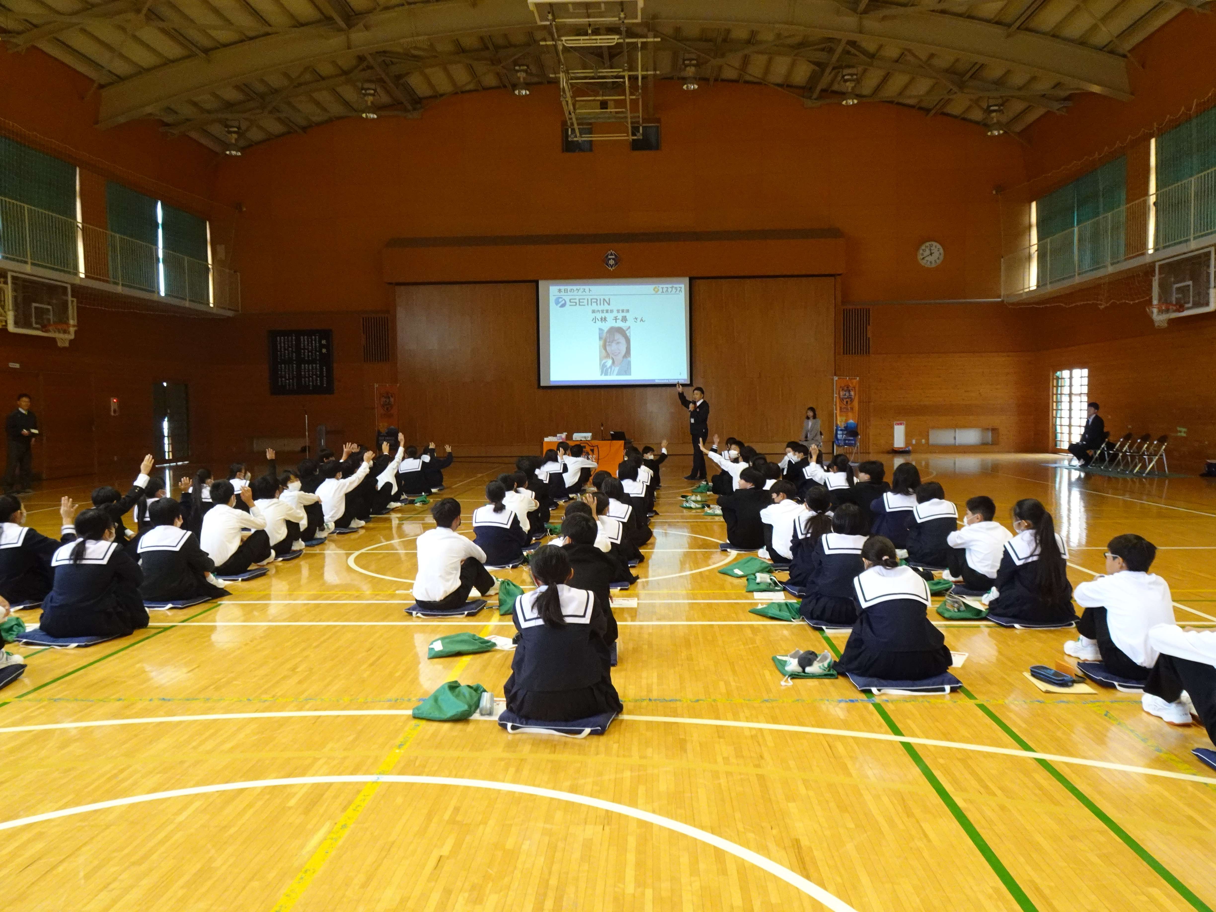 最後に、小林さんから、「医療系の仕事に就きたいと思ったのは中学生の時です。中学生の時、大きな怪我をしたときにリハビリの先生や鍼灸師の先生にお世話になりました。その時に尊敬を覚え、医療系の仕事に就きました。中学生の時の経験は大人になって大きな財産になります。楽しいと楽は別物だと考えます。楽の先に楽しいことはありません。つらいことを乗りこえてからこそ楽しいことがあります。何事にも恐れずに挑戦してみてください。今だけの時間を過ごしてください。」とメッセージを送り授業を締めくくりました。