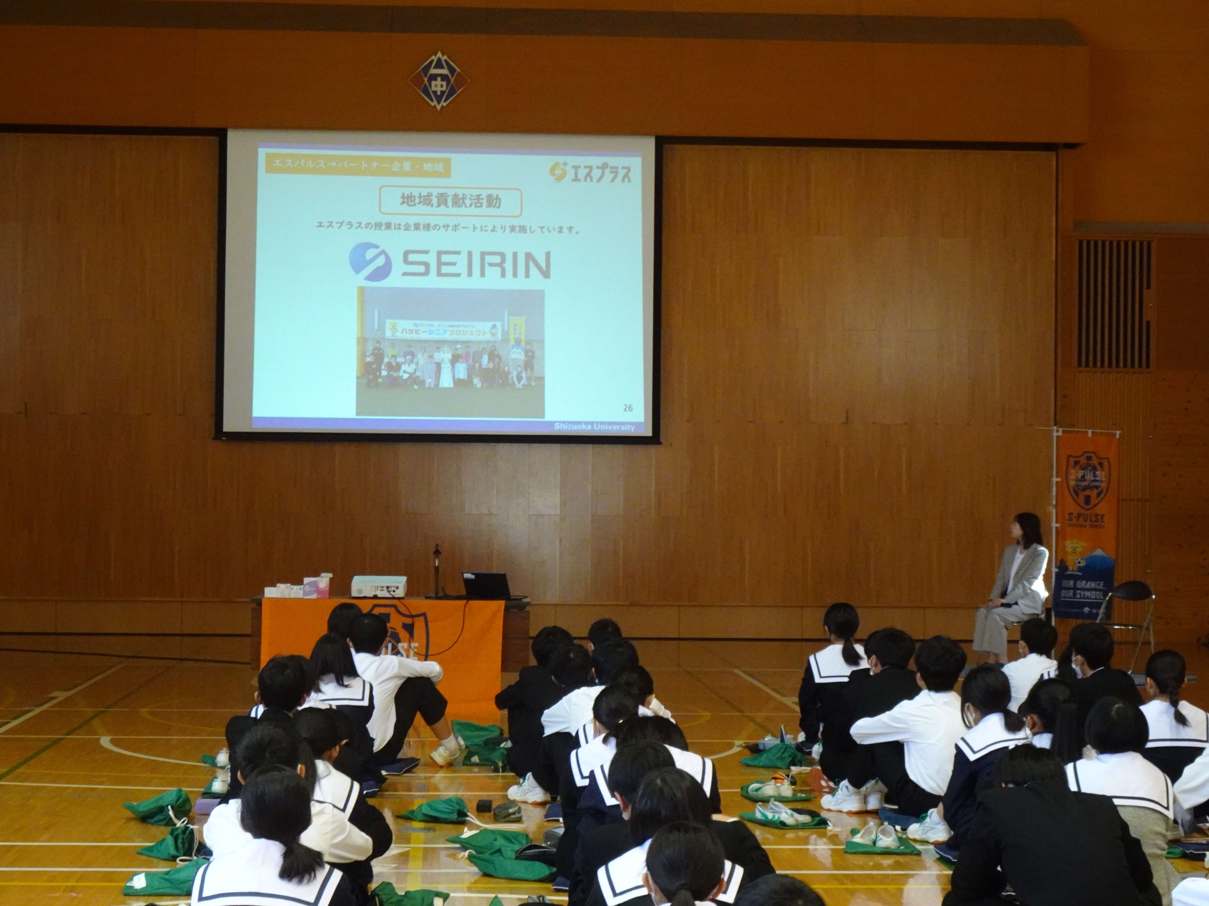 授業のはじめに、エスパルスのマスコットキャラクターや選手についてのクイズを行いました。エスパルスに興味を持っている生徒も多く、すぐに答えが出てきました。その後エスパルスとパートナー企業、地域とのつながりなどを紹介。そして、セイリン株式会社の国内営業部営業課の小林千尋さんをゲスト講師に迎え、「仕事をする時に必要なチカラや大切にしていること」について学びました。パートナー企業としてエスパルスとどのように関わっているか、また小林さんが仕事をする上で「必要なチカラ」は何かなど、分かりやすくお話していただきました。