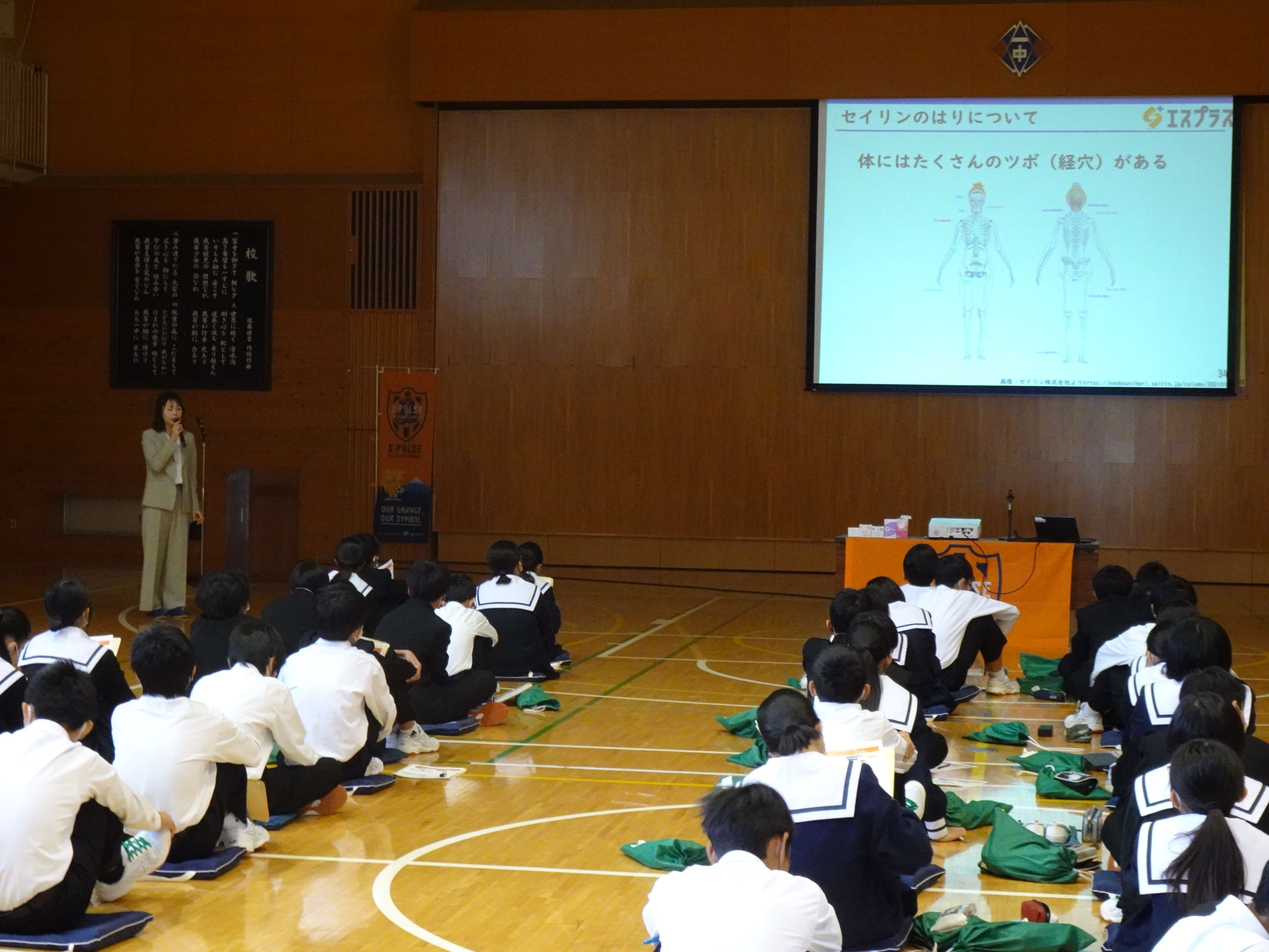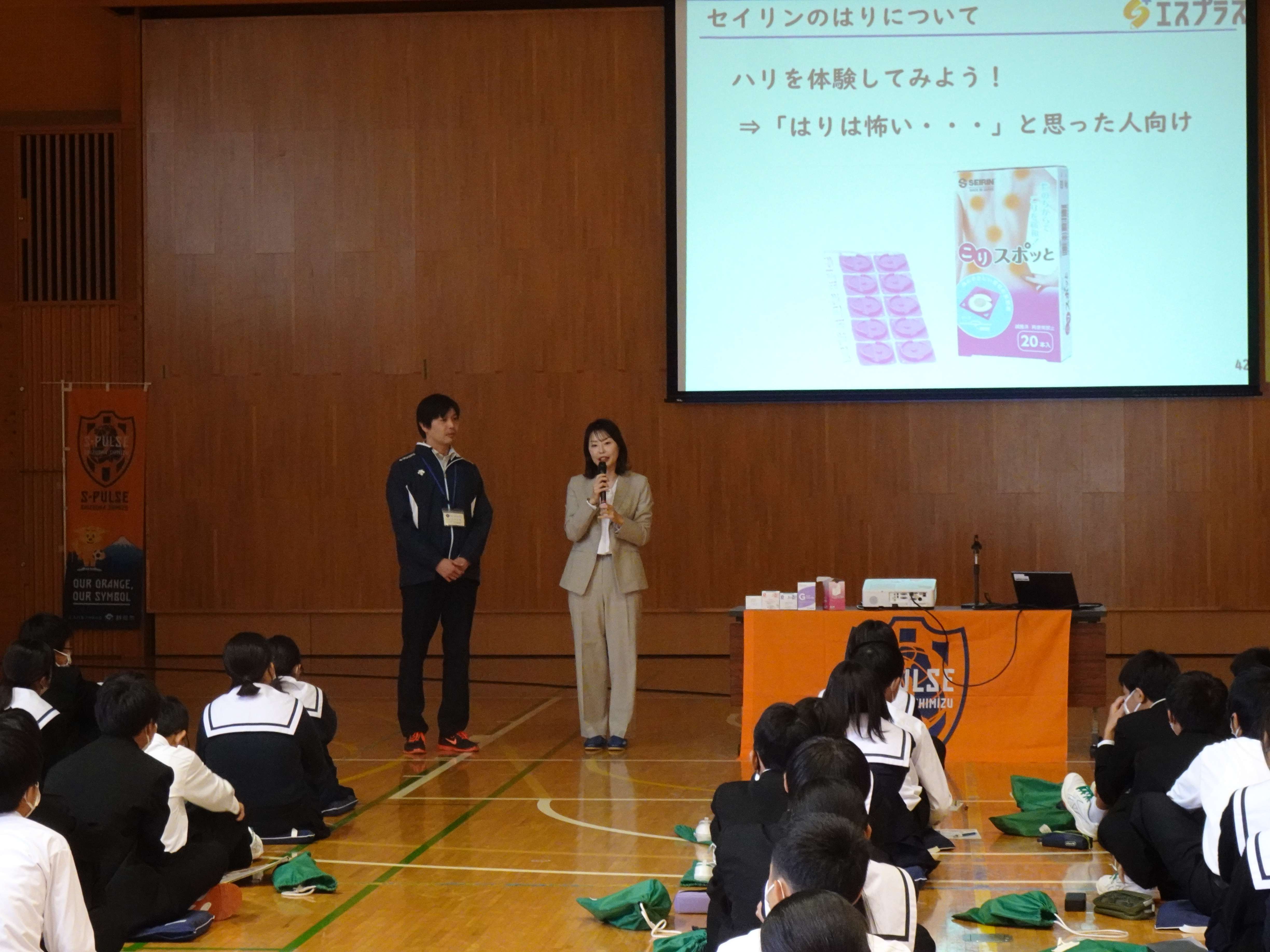 11月21日(月) 静岡市立清水第一中学校にて、クラブパートナーのセイリン株式会社よりゲスト講師1名を迎え『エスプラス』「地域貢献や社会に出て必要なチカラを考えるキャリア教育授業 ~針と鍼の違い編~」を実施しました。