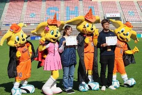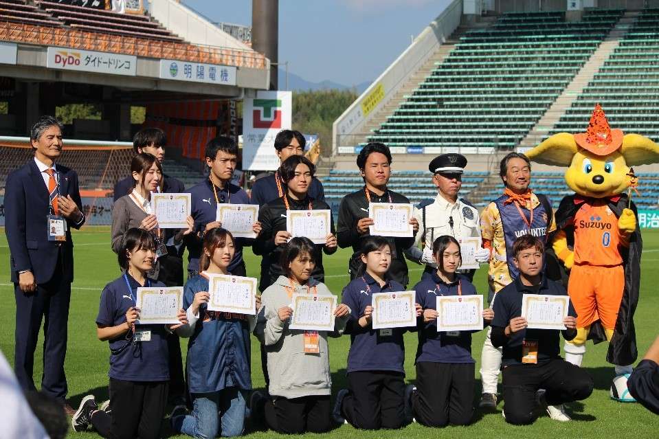 今回は特別に、試合前のピッチ脇で取材を行わせていただいた。キックオフ前のピッチでは、「ベストスタッフ2023」の表彰式が行われた。これは、「清水エスパルスおもてなしプロジェクト」の一環として行われており、今シーズン素晴らしいおもてなしで貢献した方を表彰するものだ。清水エスパルスの社員だけでなく、外部のスタッフやボランティア、警備員さんなど15名が山室晋也社長から表彰された。表彰された方々は賞状を受け取るとハロウィン衣装に身を包んだパルちゃんファミリーと記念撮影をするなどして、受賞を喜んでいた。