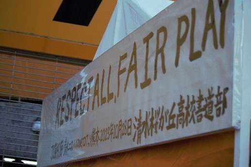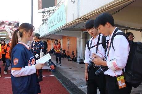 午前10時、キックオフ3時間前にも関わらず、スタジアム前は多くのサポーターによって賑わっていた。J1昇格がかかる大事な試合ということで、サポーターの士気も高まっていると感じられた。スタジアム入り口では、本校書道部が担当するウェルカムボードが観客を出迎えていた。