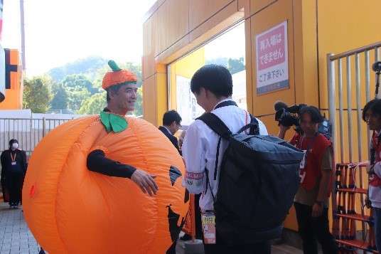 次に、株式会社エスパルス代表取締役の山室晋也社長に話を伺った。当日はハロウィンが近かったため、社長がかぼちゃに仮装し、スタジアム入り口に立って観客を迎えていた。開門前のわずかな時間にお話を伺うことができた。
