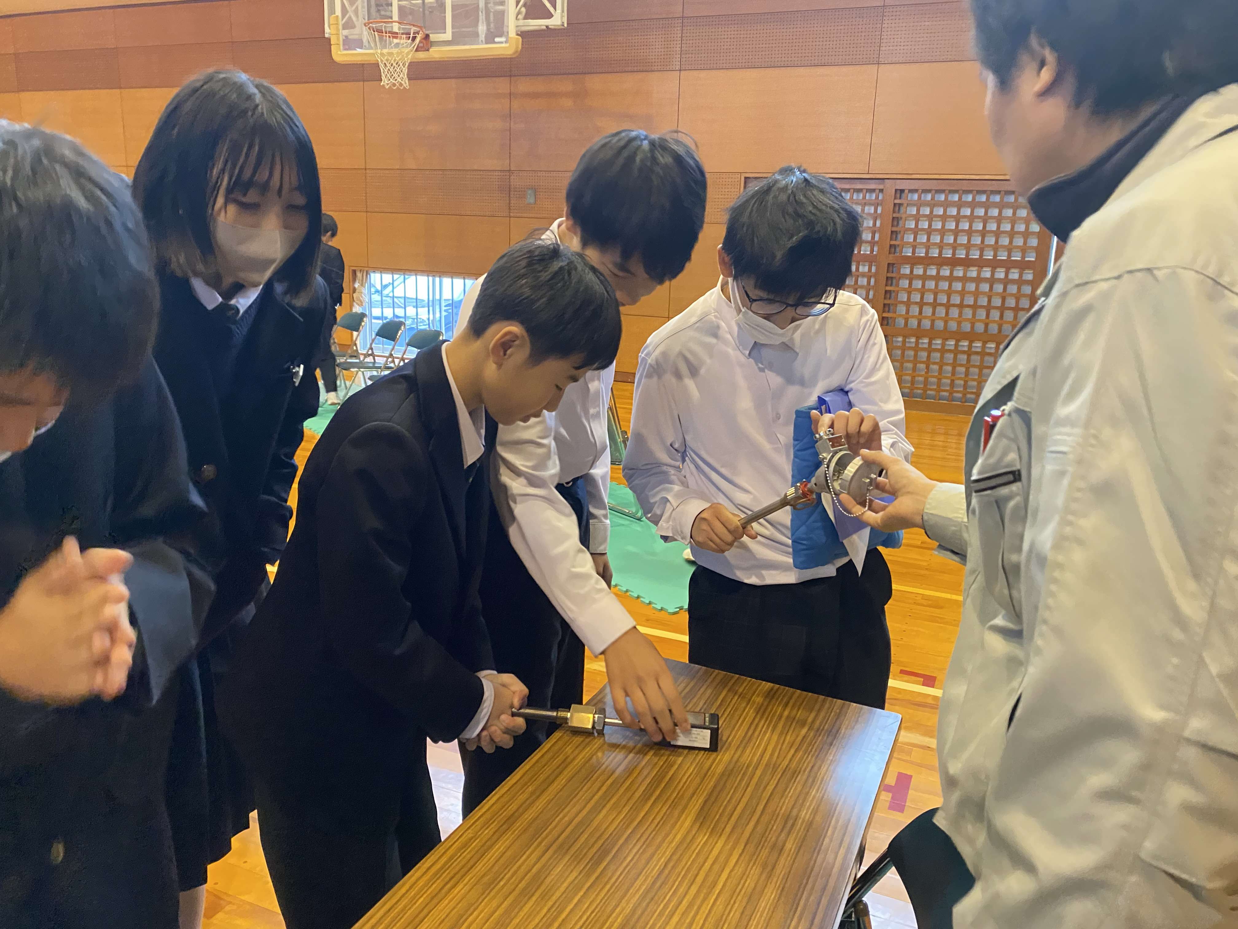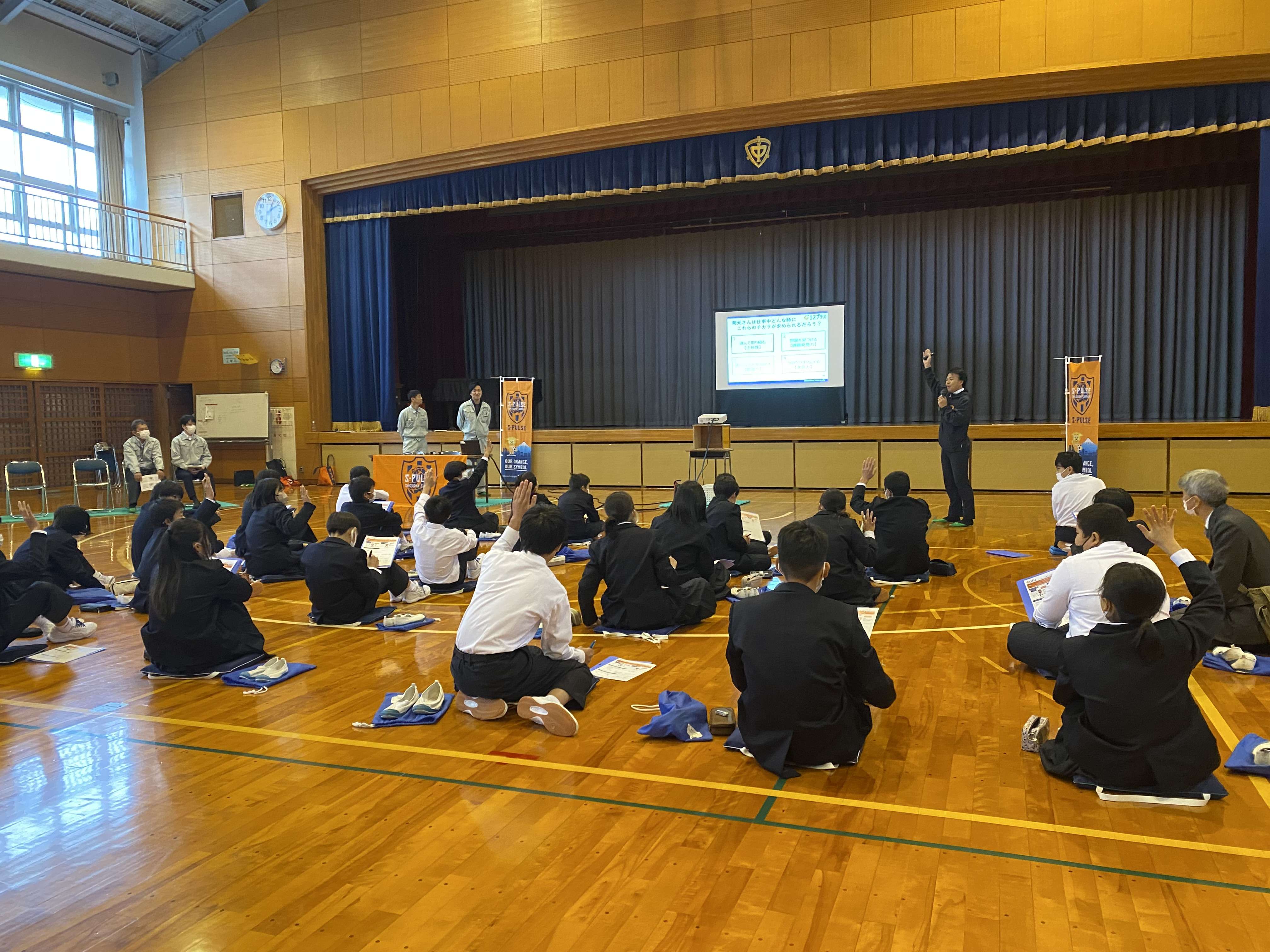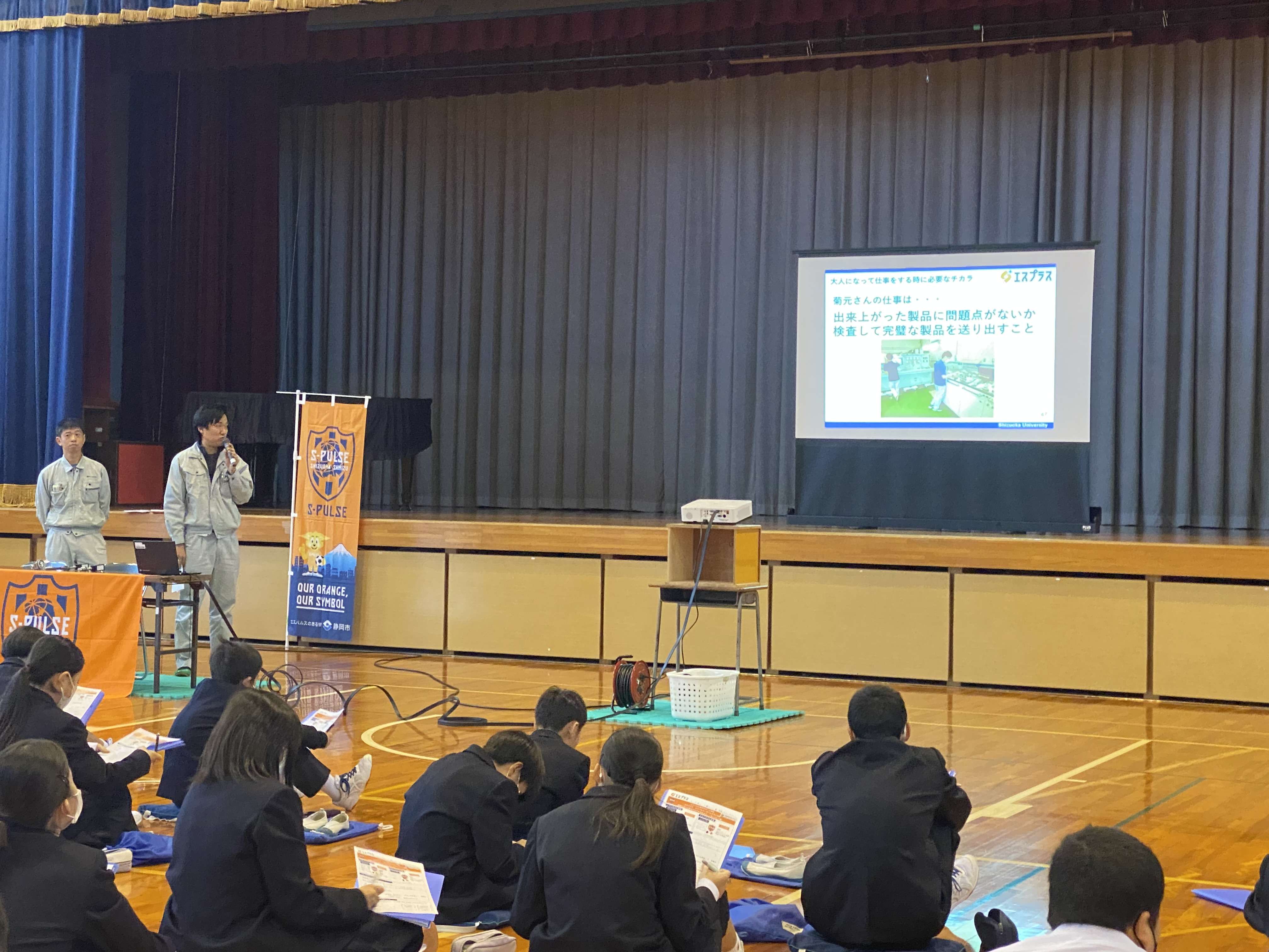 12月5日(火) 静岡市立清水第五中学校にて、クラブパートナーの明陽電機株式会社よりゲスト講師2名を迎え『エスプラス』「地域貢献や社会に出て必要なチカラを考えるキャリア教育授業 ~モノづくり編~」を実施しました。