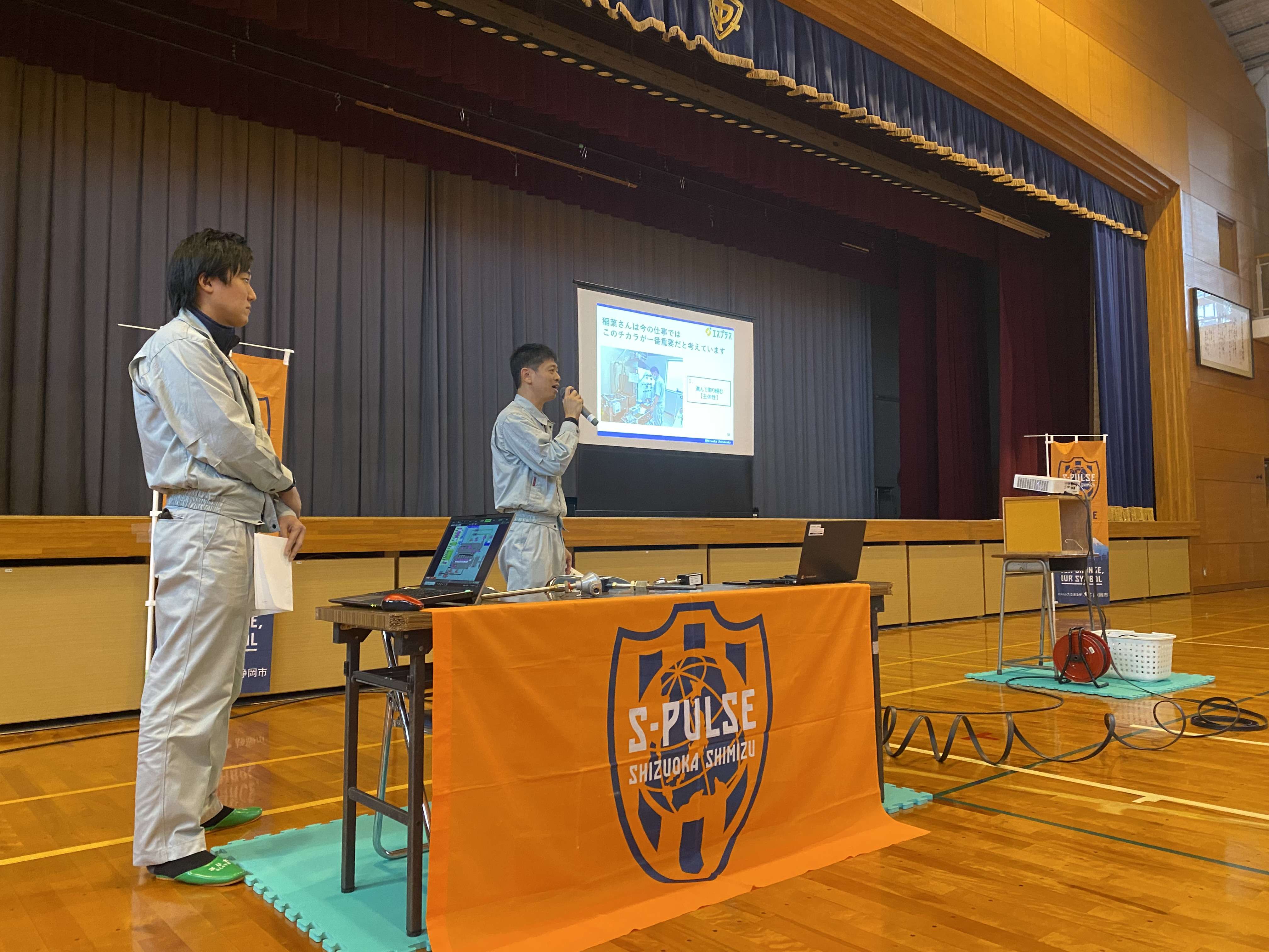 最初に、「サッカーやエスパルスを通した地域(会社・市民)との関わりを考えよう」というテーマでエスパルスとパートナー企業、地域とのつながりを考えました。そして明陽電機の菊本柾人さん、稲葉駿輔さんをゲスト講師に迎え、「仕事をする時に必要なチカラ」や「地元で働くこと」について学びました。