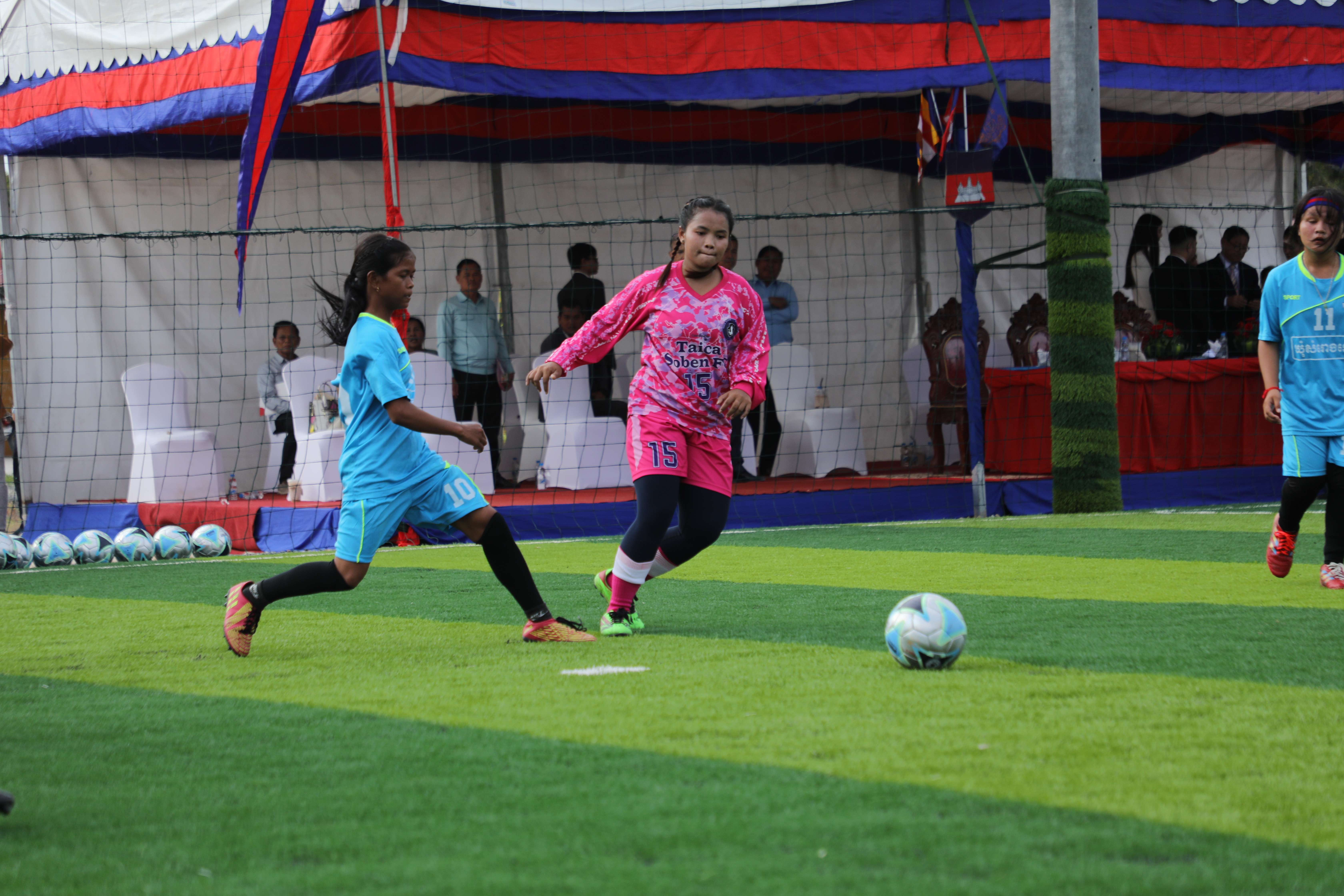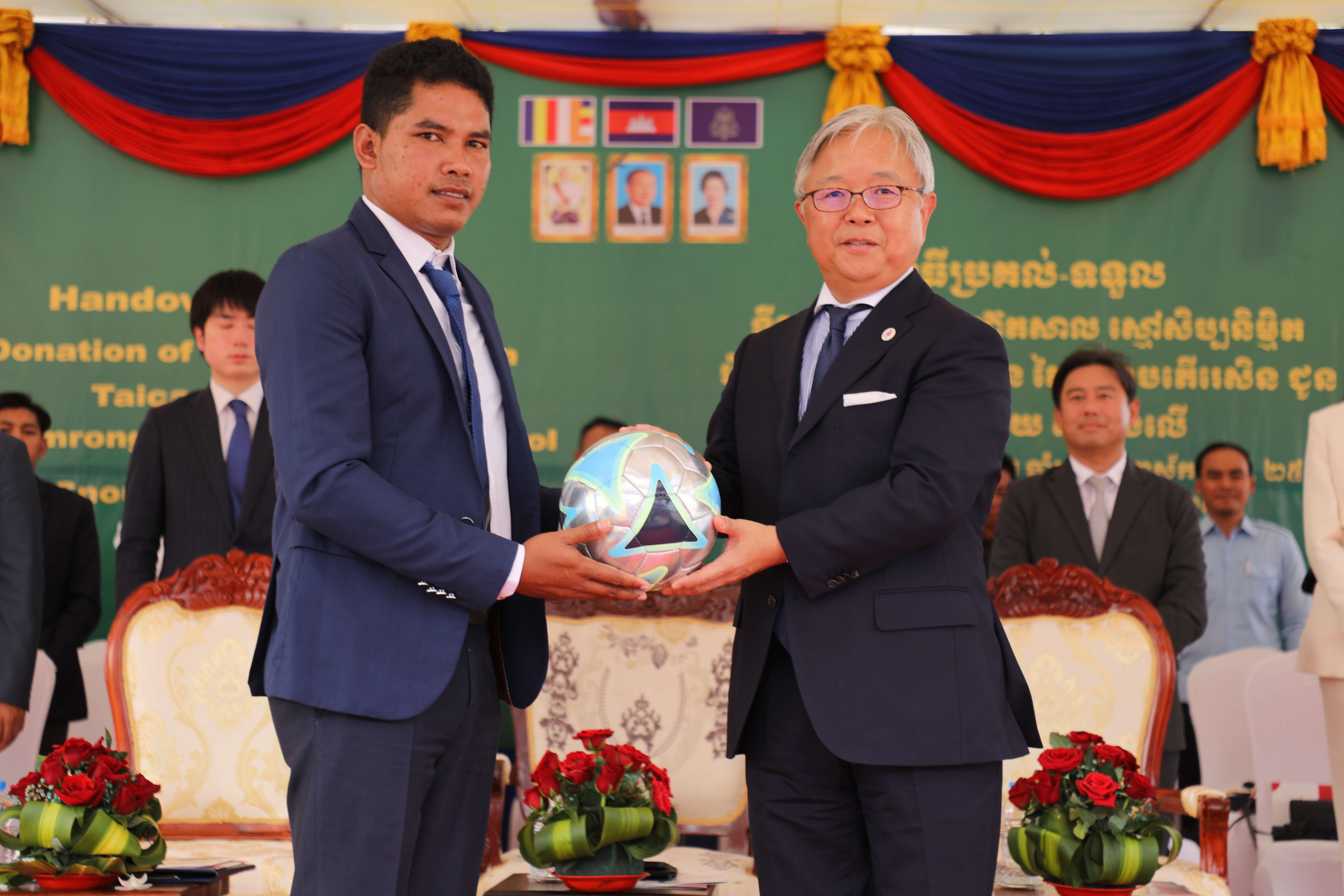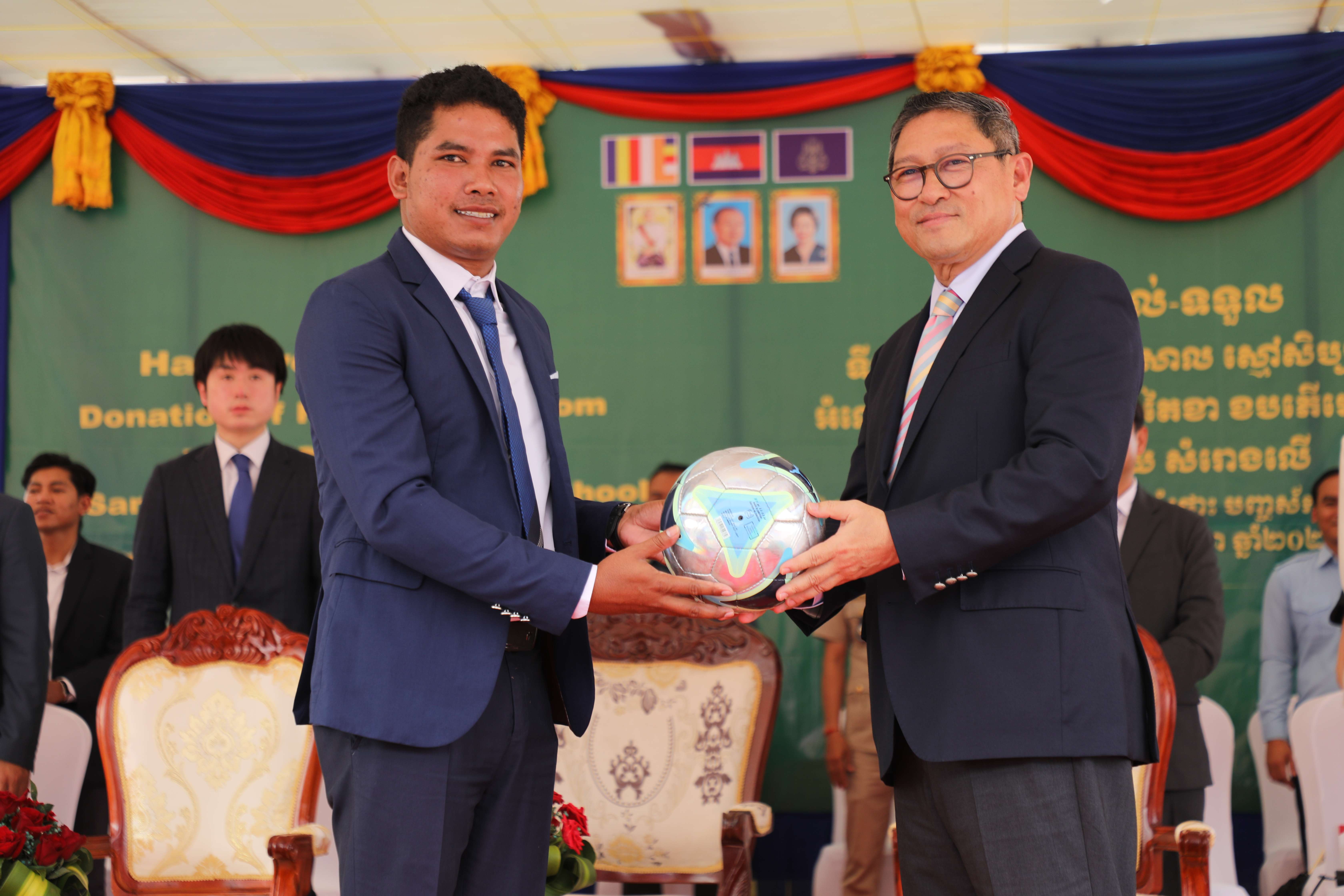 同校の女子サッカーチームをはじめとする生徒たちが、スポーツを通して健やかに成長し、カンボジア王国の発展に寄与する人材になるように願いを込めてお渡しいたしました。