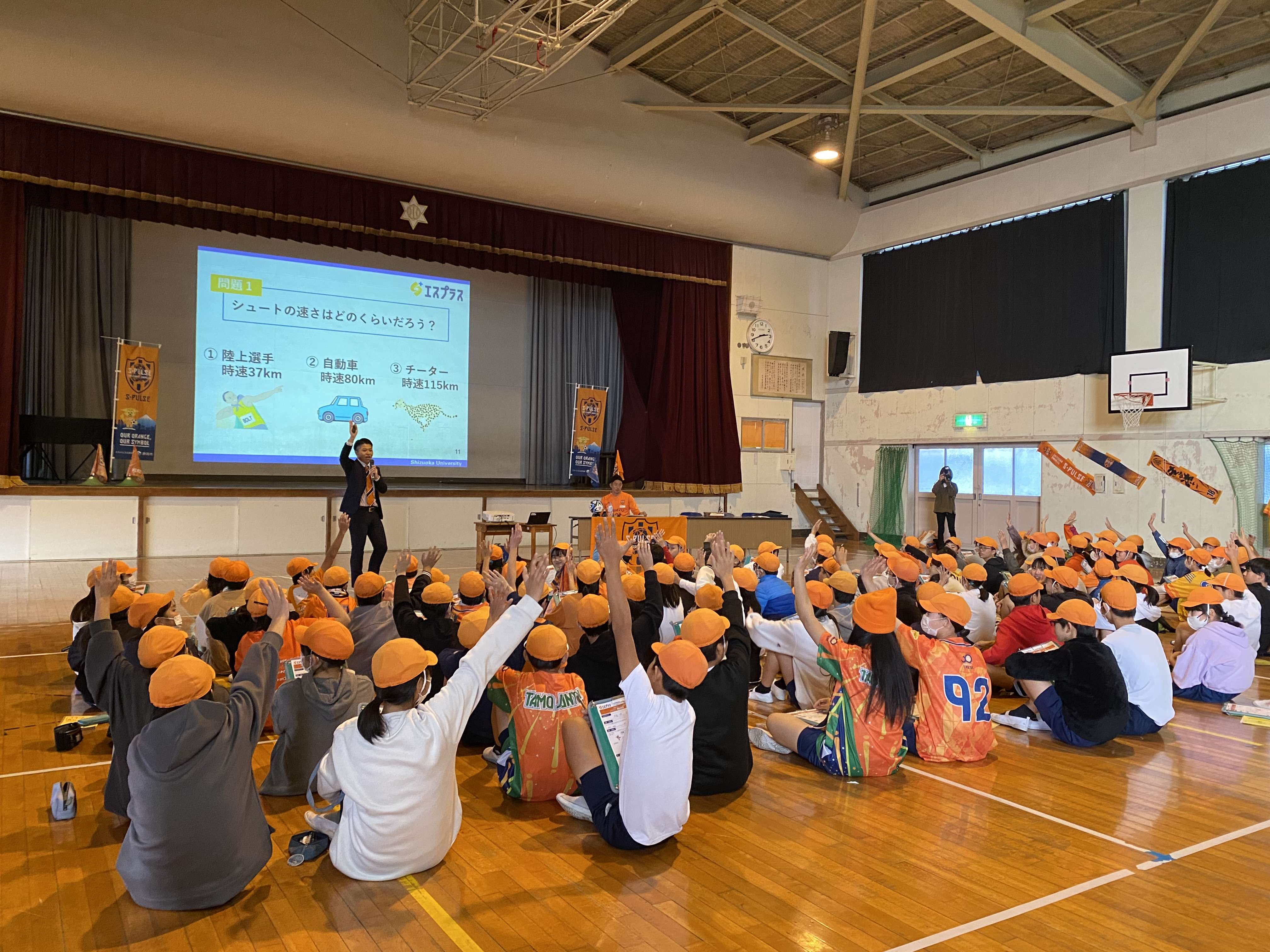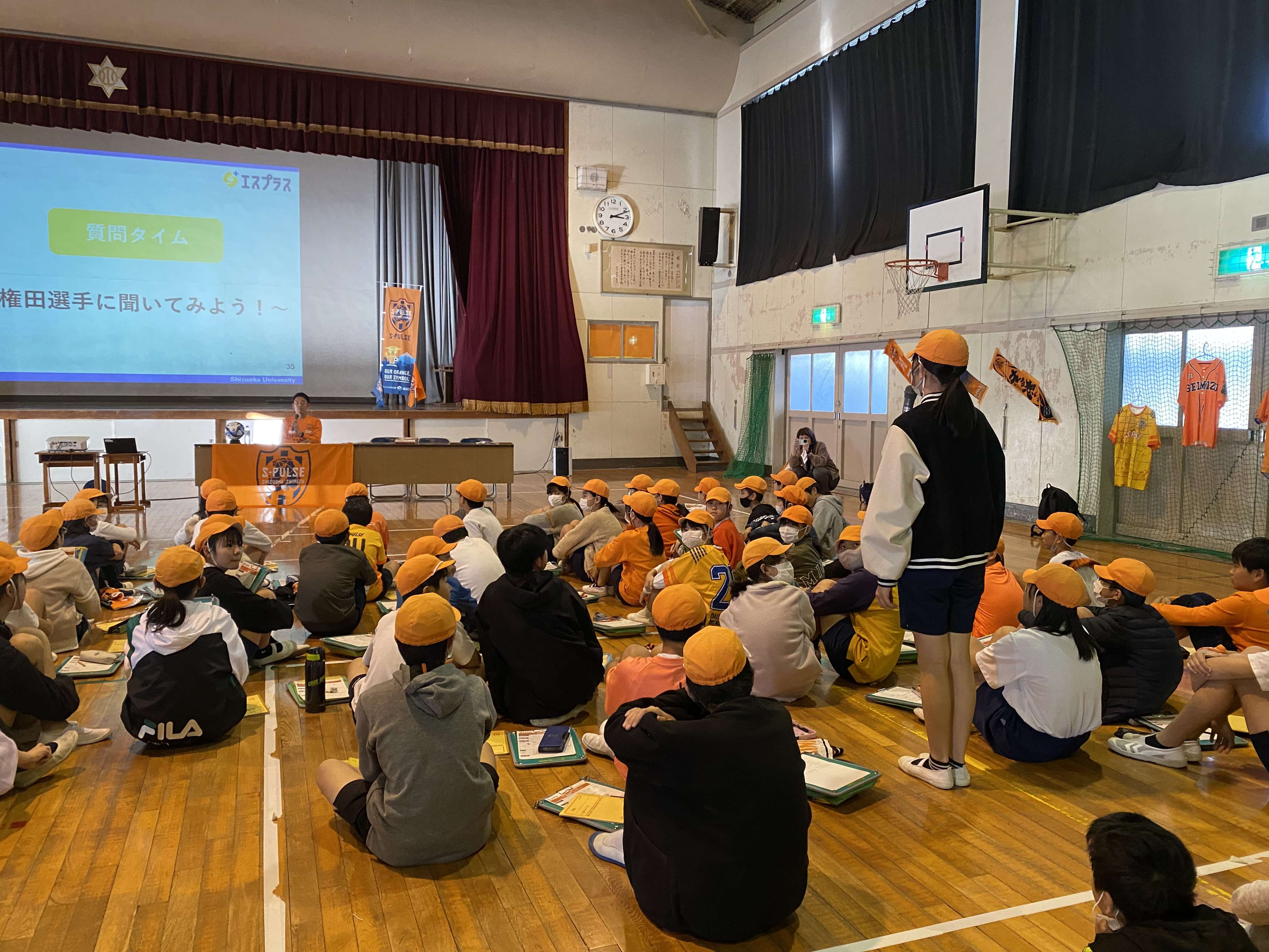 最初に、エスパルスについてのクイズを行った後、権田選手が体育館に登場すると児童からは驚きと喜びの声が広がりました。小学生の時にはすでに170㎝あったという権田選手の話から、食事や規則正しい生活の大切さが伝わりました。その後、本日の「サッカーを科学的に考えてみよう」をテーマに、サッカーをプレーするのに算数や理科が深く関わっていることについて学びました。