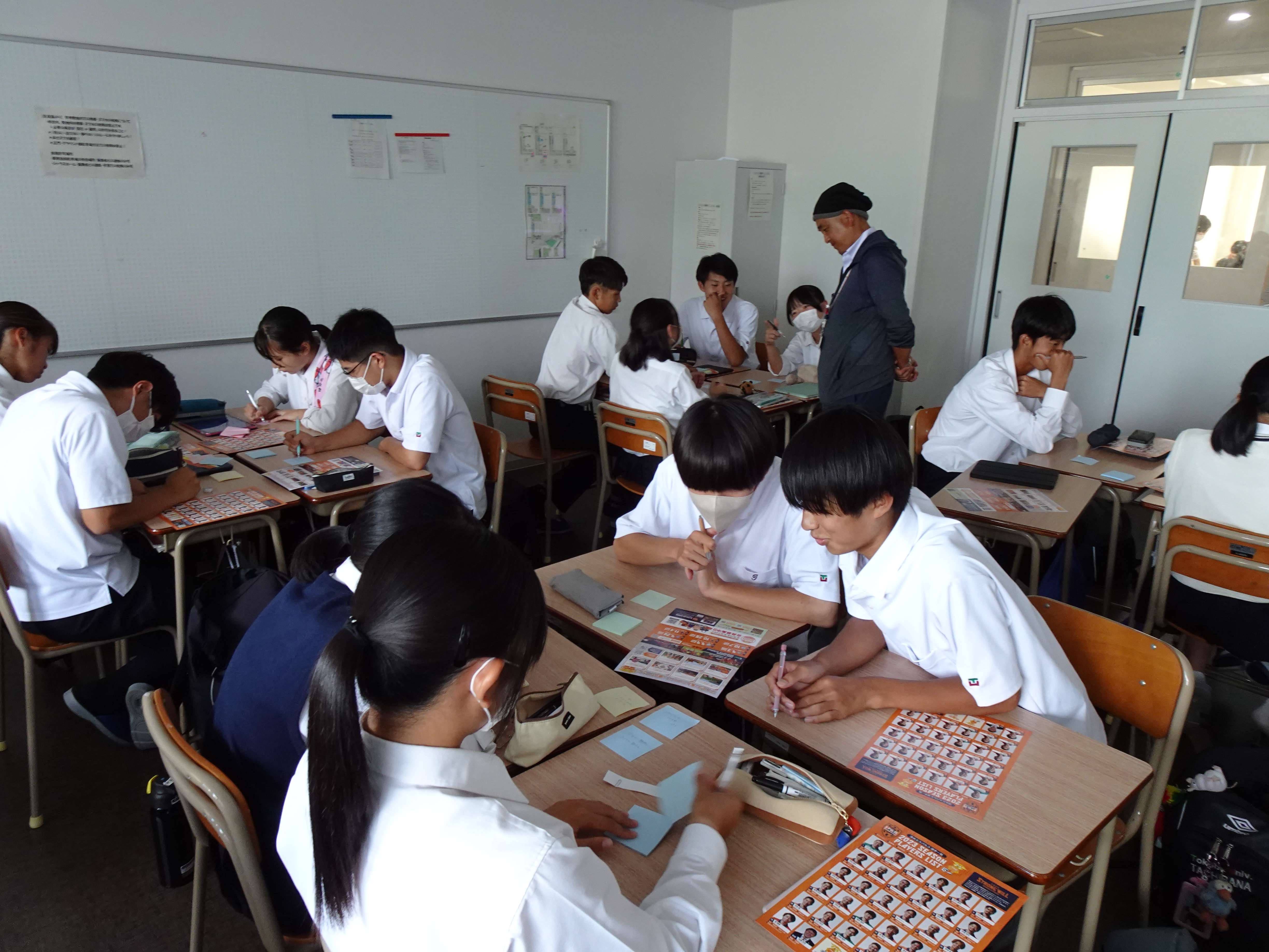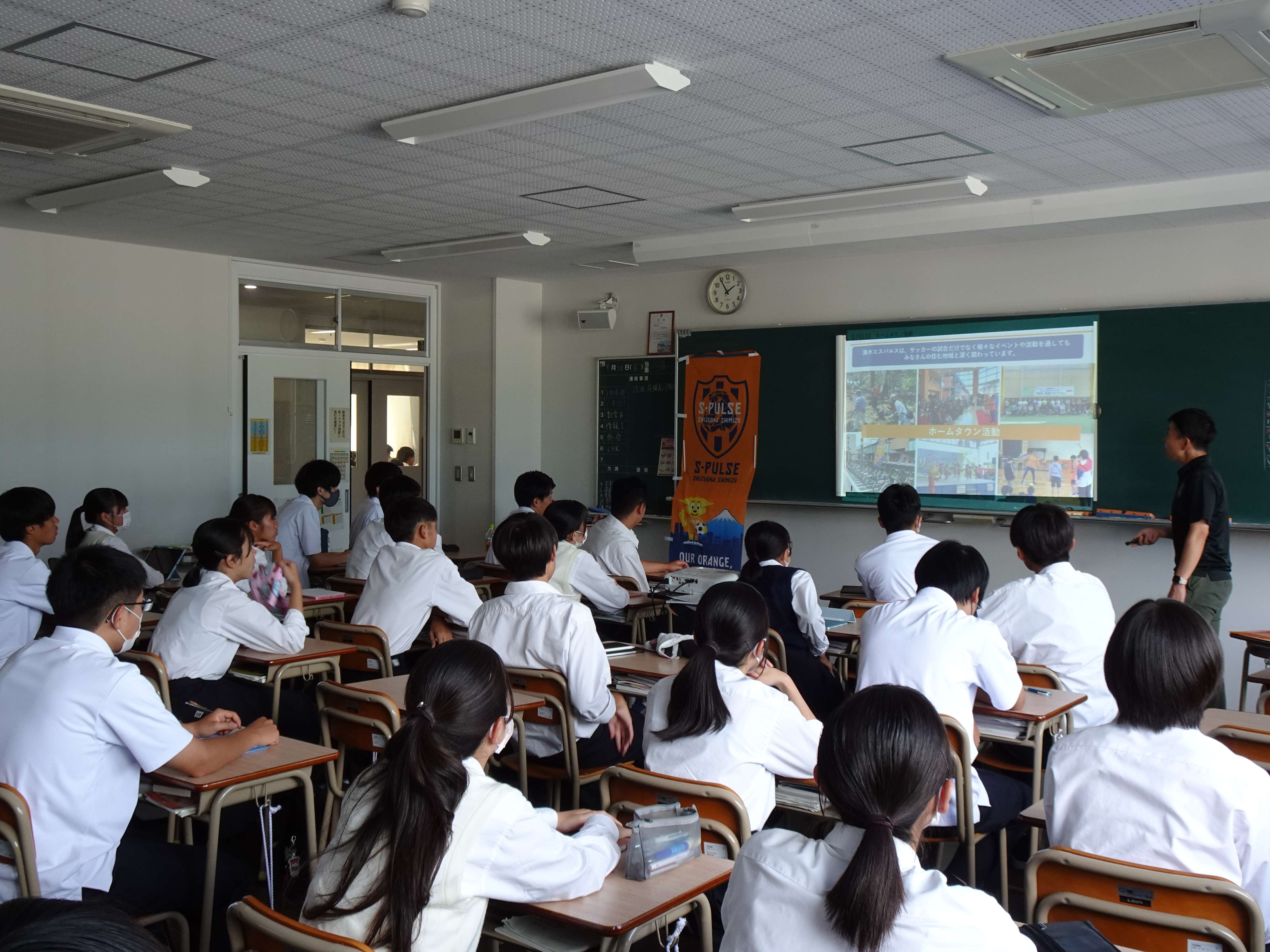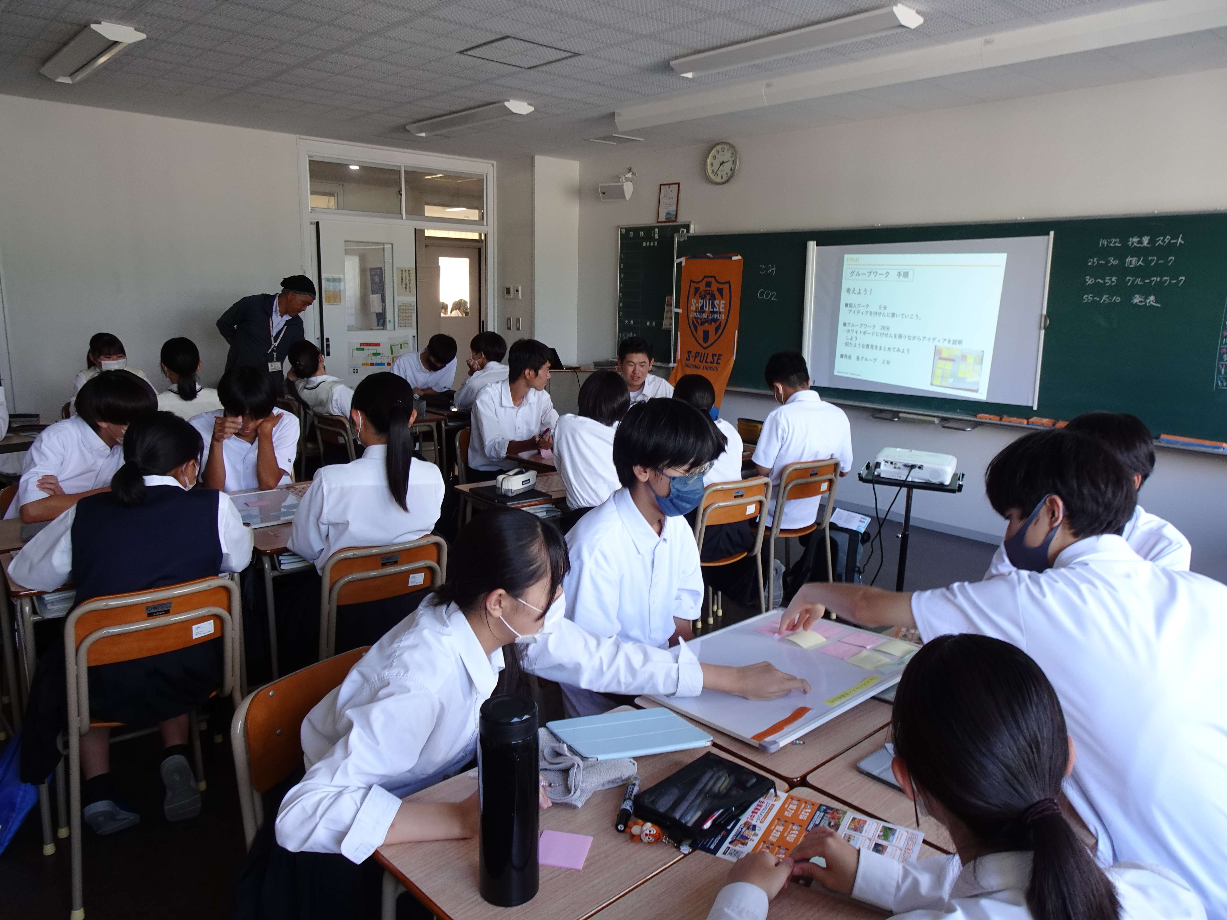 今回エスパルスは1-10クラスを担当し、ゼロカーボンプロスポーツクラブ宣言をはじめ、行政やパートナー企業と連携しながら行っている三保海岸清掃や、脱プラスチックに向けた紙ファイルの利用促進、また小中学校に実施している環境授業などの取り組みを紹介し、『プラスチックごみ削減や環境問題のために清水エスパルス×常葉橘高校でできる取り組みを考えよう!』をテーマにワークショップを行いました。高校生の目線で環境問題を捉え、柔軟なアイデアを話し合いました。