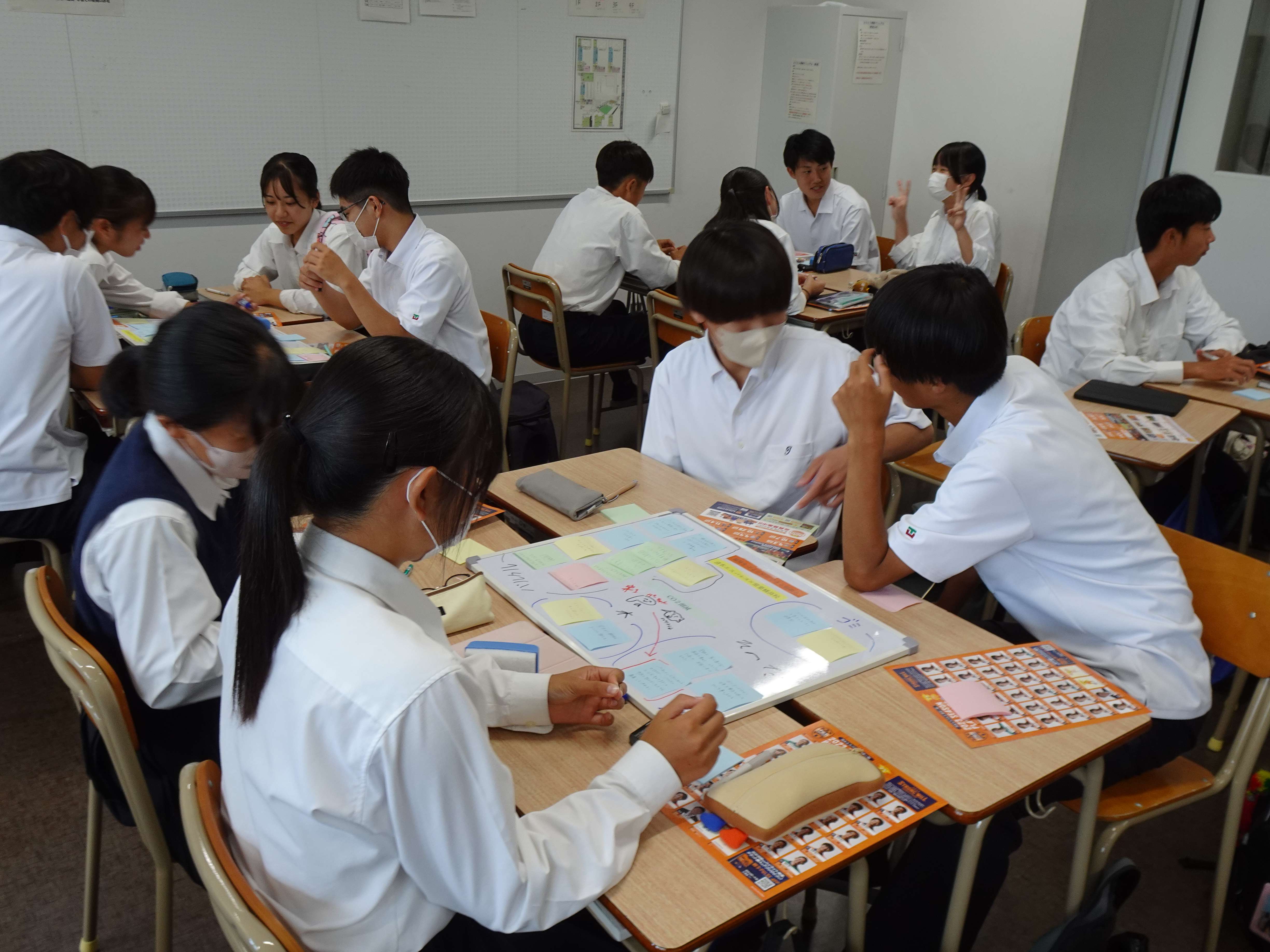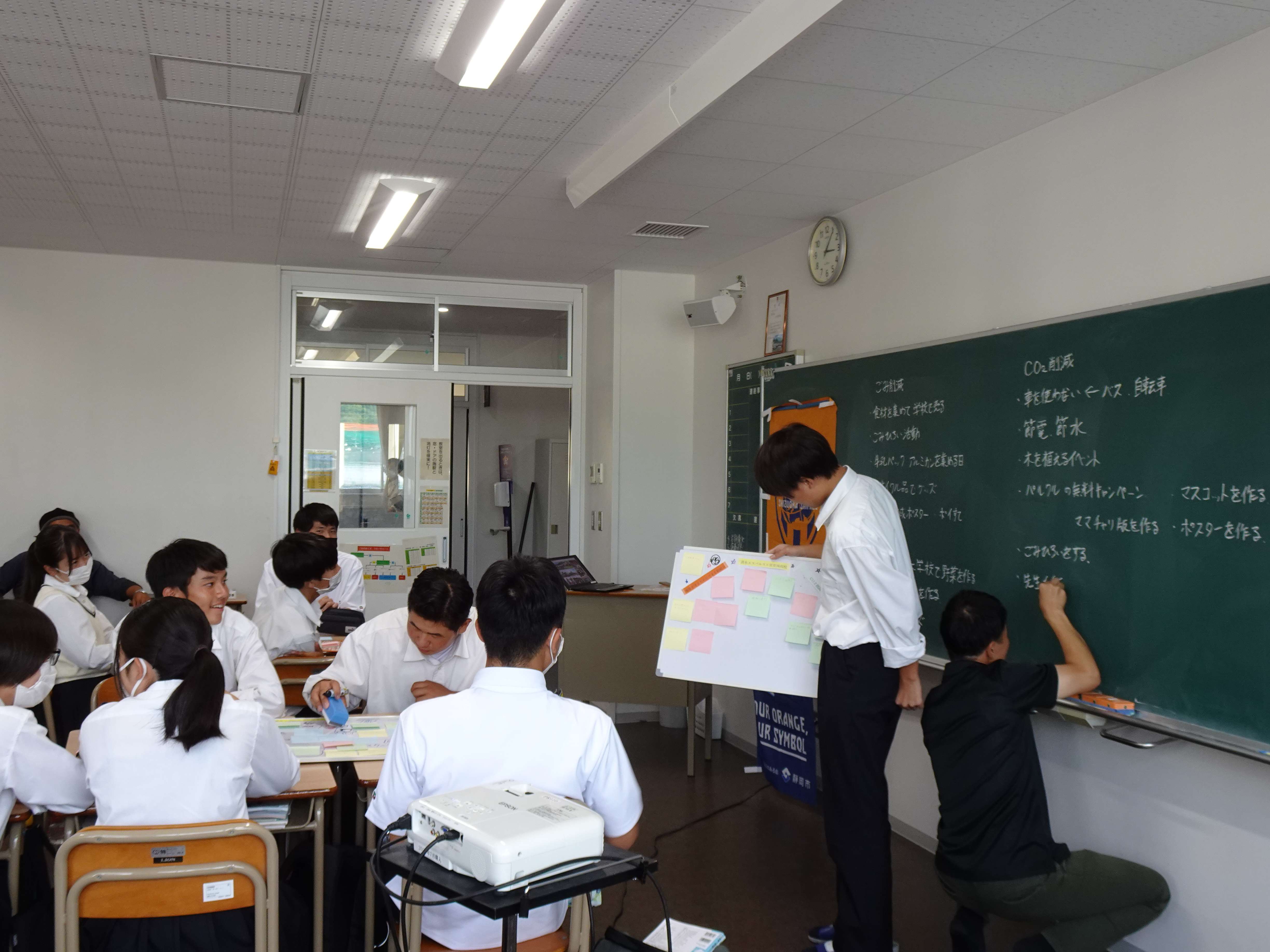 授業内容は、1回目にまず静岡市ごみ減量推進課より「プラスチックごみの現状について」の説明があり、その後各企業が環境への取り組みなどを講義し、環境をテーマとしたSDGsに関するワークショップの課題を生徒に提示しました。2回目にクラスごとの発表で優秀チームを決め、3回目に各クラスの優秀チームが学年発表を行いました。