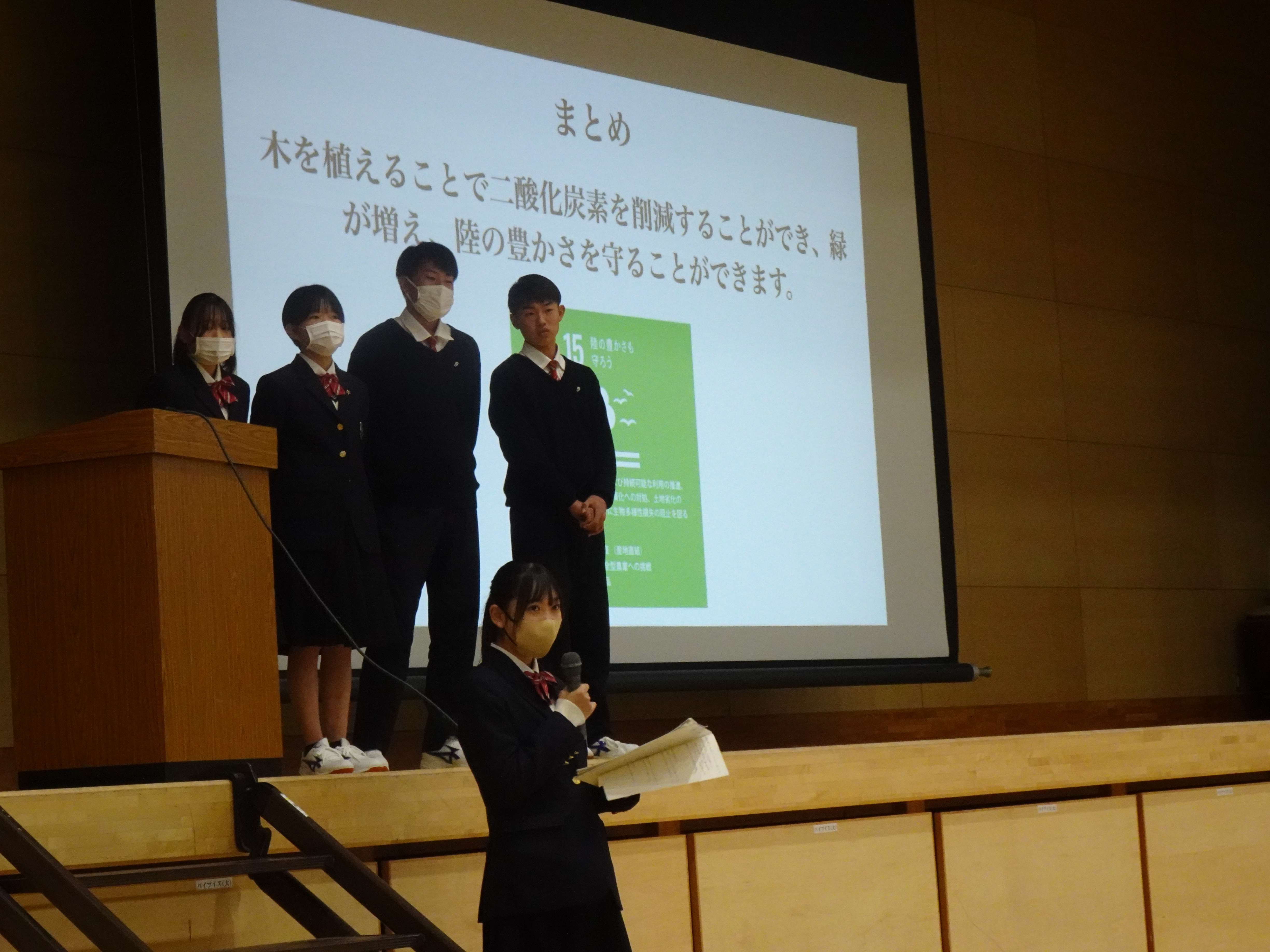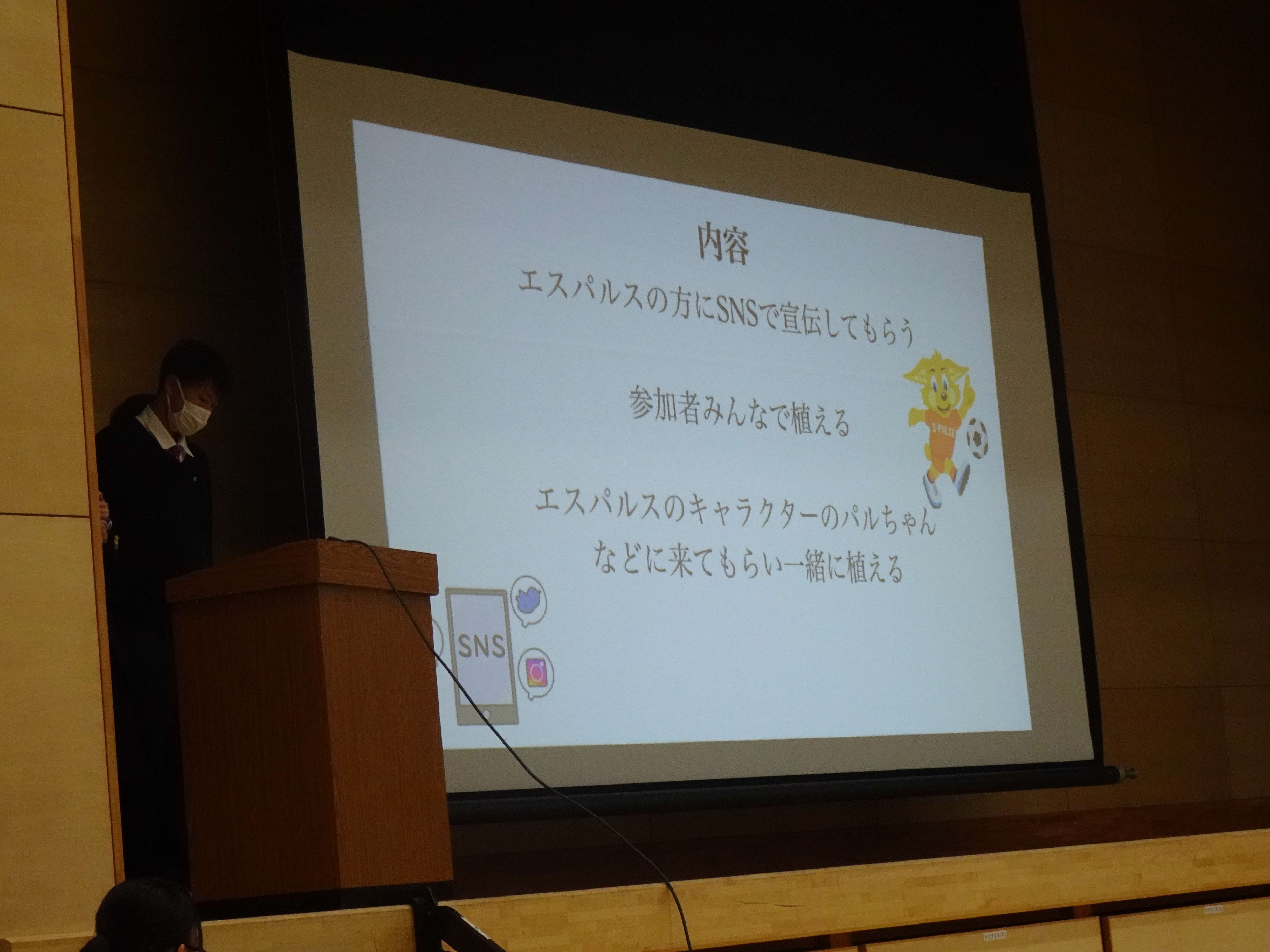 そして、クラス代表として「静岡市内で生徒やエスパルスファミリーで植樹を行う」を提案したグループが学年発表会で発表を行いました。少し緊張した様子でしたが立派にプレゼンされ、クラブから「常葉橘高校とエスパルスだけではなく、サポーターや地域の人たちと一緒に行うところが素晴らしい」とコメントを送りました。
